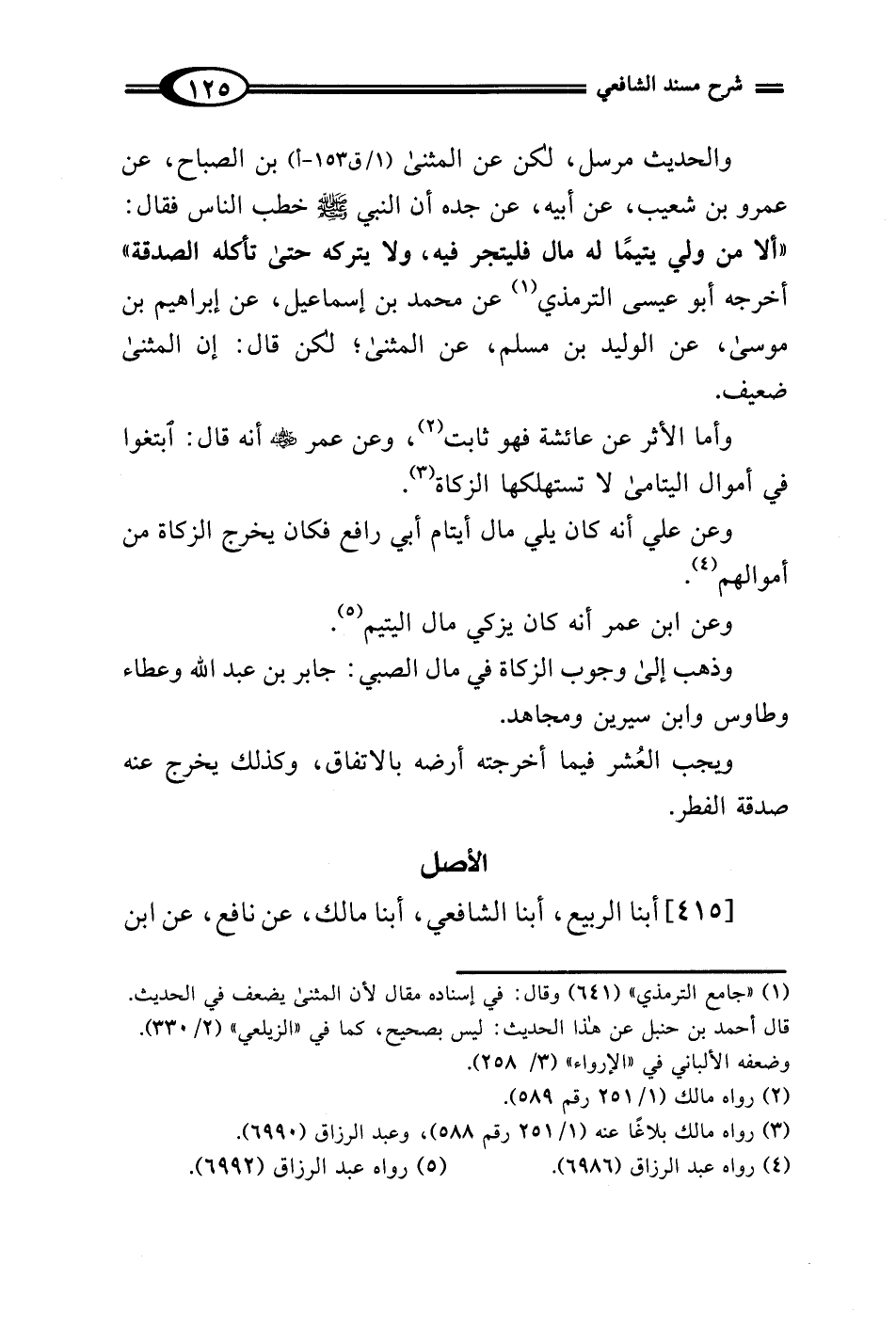 والحديث مرسل، لكن عن المثنى بن الصباح، عن عمرو بن شعيب، عن أبيه، عن جده أن النبي - صلى الله عليه وسلم - خطب الناس فقال: "ألا من ولي يتيمًا له مال فليتجر فيه، ولا يتركه حتى تأكله الصدقة" أخرجه أبو عيسى الترمذي (¬1) عن محمَّد بن إسماعيل، عن إبراهيم بن موسى، عن الوليد بن مسلم، عن المثنى؛ لكن قال: إن المثنى ضعيف.