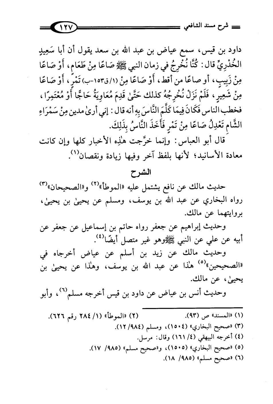 داود بن قيس، سمع عياض بن عبد الله بن سعد يقول أن أبا سَعِيدٍ الخُدْرِيِّ قال: كُنَّا نُخْرِجُ في زمان النبي - صلى الله عليه وسلم - صَاعًا مِنْ طَعَامٍ، أَوْ صَاعًا مِنْ زَبِيبٍ، أو صاعًا من أقط، أَوْ صَاعًا مِنْ تَمْرٍ، أَوْ صَاعًا مِنْ شَعِيرٍ، فَلَمْ نَزَلْ نُخْرِجُهُ كذلك حَتَّى قَدِمَ مُعَاوِيَةُ حَاجًّا أَوْ مُعْتَمِرًا، فخطب الناس فَكَانَ فِيمَا كَلَّمَ النَّاسَ بِهِ أنه قال: إني أرى مدين مِنْ سَمْرَاءِ الشَّامِ تَعْدِلُ صَاعًا مِنْ تَمْرٍ فَأَخَذَ النَّاسُ بِذَلِكَ.