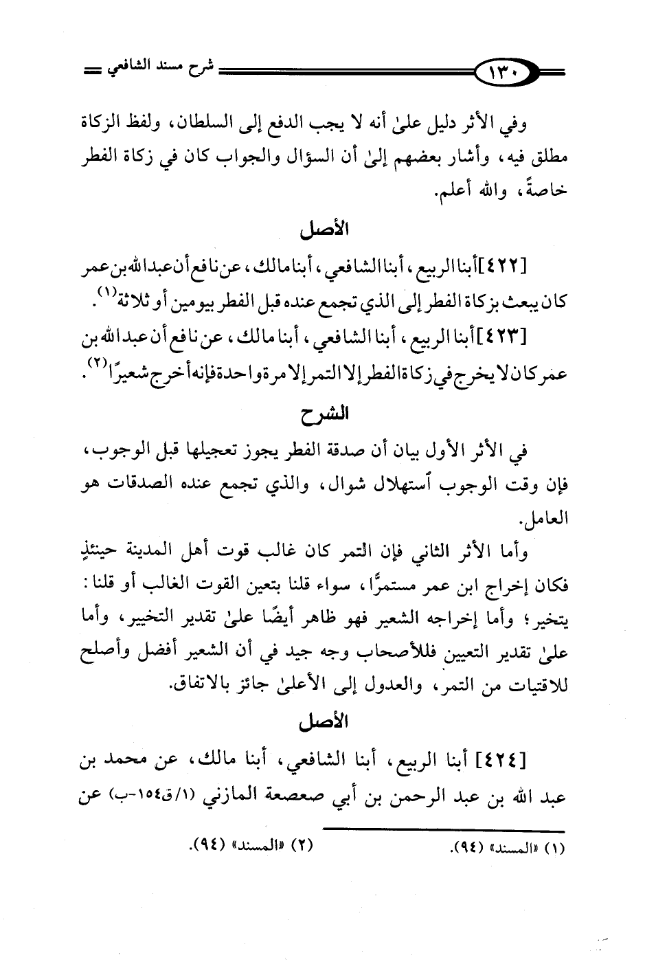 [423] أبنا الربيع، أبنا الشافعي، أبنا مالك، عن نافع أن عبد الله بن عمر كان لا يخرج في زكاة الفطر إلا التمر إلا مرة واحدة فإنه أخرج شعيرًا (¬2).