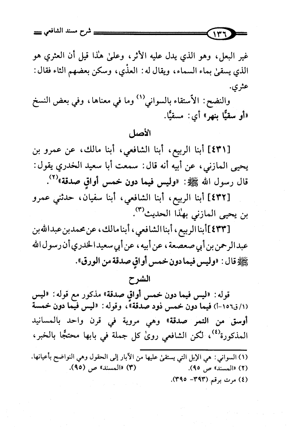 [431] أبنا الربيع، أبنا الشافعي، أبنا مالك، عن عمرو بن يحيي المازني، عن أبيه أنه قال؛ سمعت أبا سعيد الخدري يقول: قال رسول الله - صلى الله عليه وسلم -: "وليس فيما دون خمس أواقٍ صدقة" (¬2).