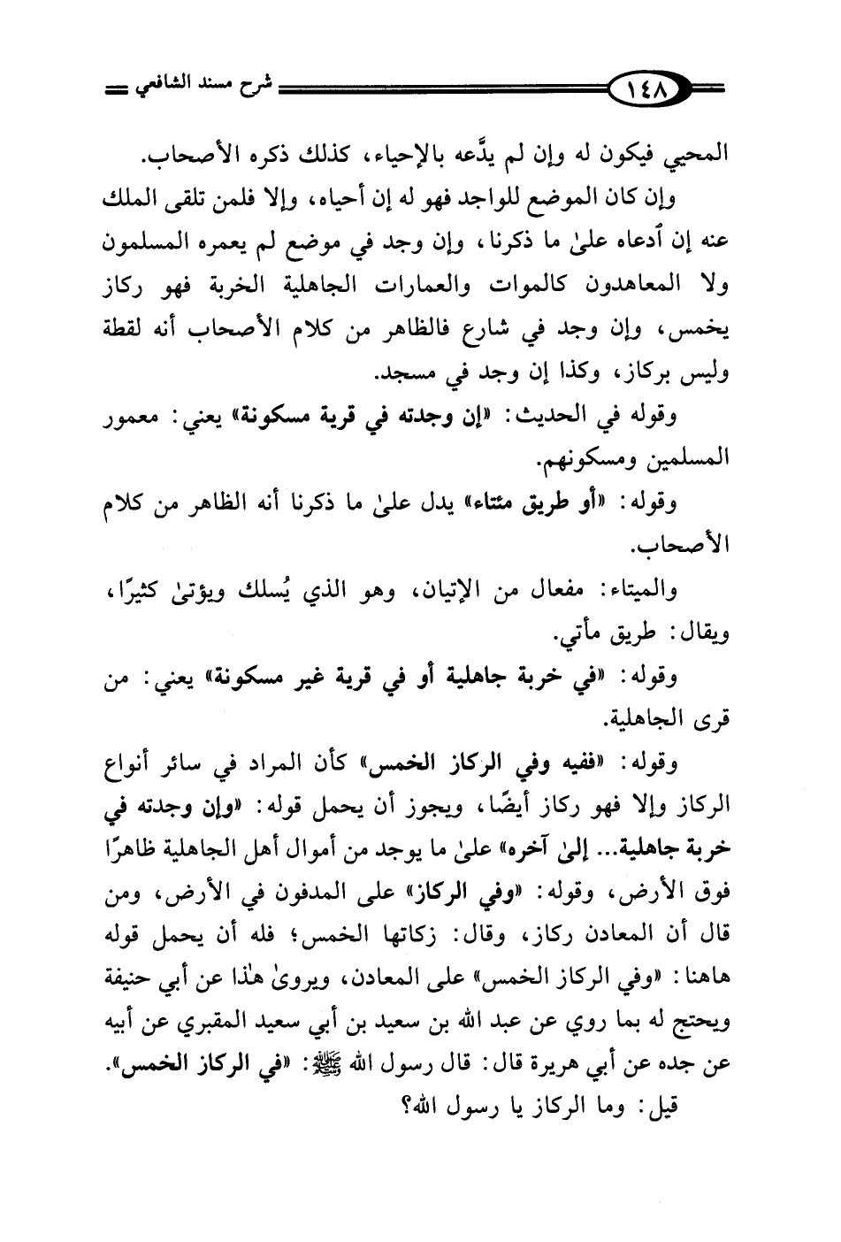 وقوله: "ففيه وفي الركاز الخمس" كأن المراد في سائر أنواع الركاز وإلا فهو ركاز أيضًا، ويجوز أن يحمل قوله: "وإن وجدته في خربة جاهلية ... إلى آخره" على ما يوجد من أموال أهل الجاهلية ظاهرًا فوق الأرض، وقوله: "وفي الركاز" على المدفون في الأرض، ومن قال أن المعادن ركاز، وقال: زكاتها الخمس؛ فله أن يحمل قوله ها هنا: "وفي الركاز الخمس" على المعادن، ويروى هذا عن أبي حنيفة ويحتج له بما روي عن عبد الله بن سعيد بن أبي سعيد المقبري عن أبيه عن جده عن أبي هريرة قال: قال رسول الله - صلى الله عليه وسلم -: "في الركاز الخمس".
