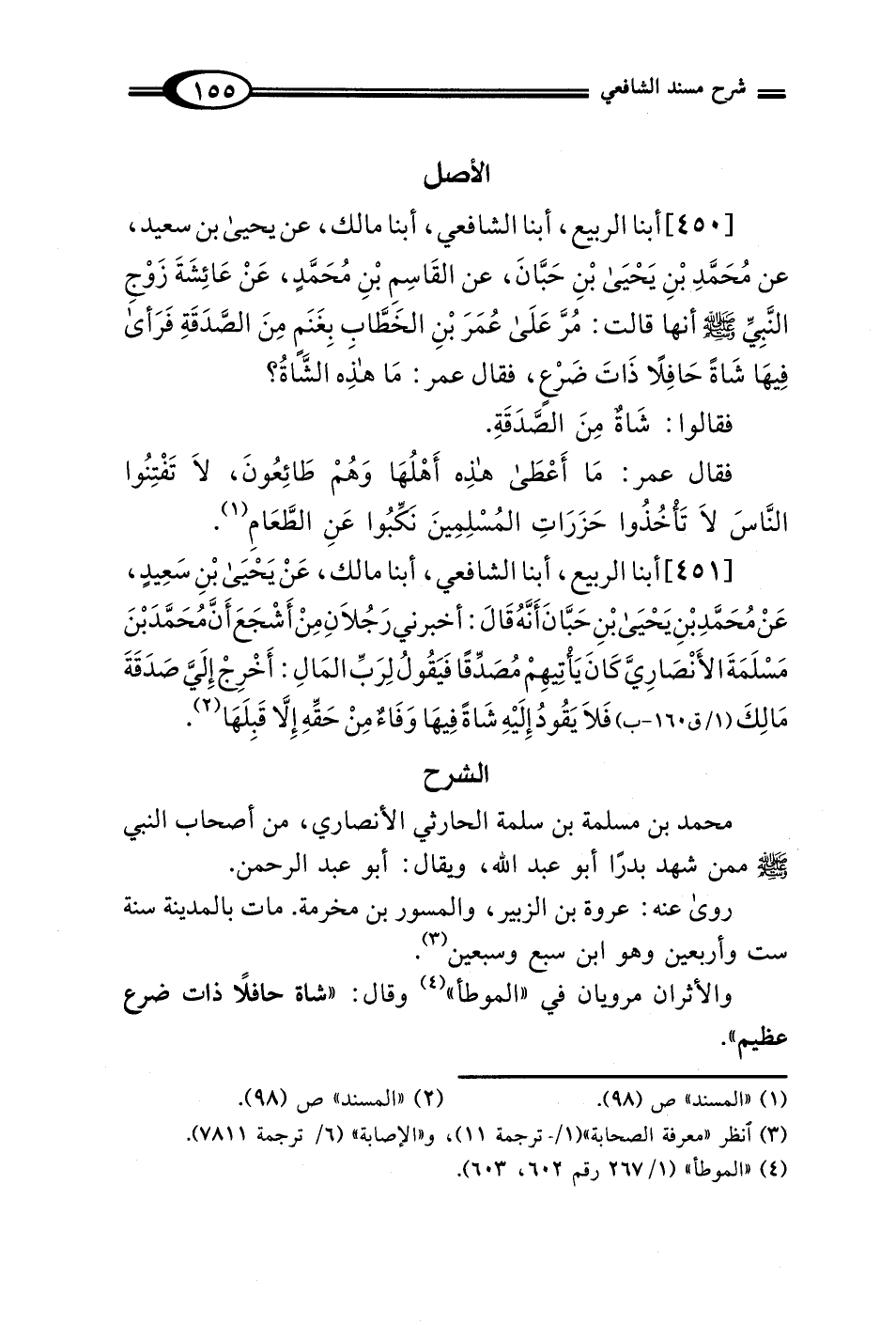[451] أبنا الربيع، أبنا الشافعي، أبنا مالك، عَنْ يَحْيَى بْنِ سَعِيدٍ، عَنْ مُحَمَّدِ بْنِ يَحْيَى بْنِ حَبَّانَ أَنَّهُ قَالَ: أخبرني رَجُلاَنِ مِنْ أَشْجَعَ أَنَّ مُحَمَّدَ بْنَ مَسْلَمَةَ الأَنْصَارِيَّ كَانَ يأُتِيهِمْ مُصَدِّقًا فَيَقُولُ لِرَبِّ المَالِ: أَخْرِجْ إِلَيَّ صَدَقَةَ مَالِكَ فَلاَ يَقُودُ إِلَيْهِ شَاةً فِيهَا وَفَاءٌ مِنْ حَقِّهِ إِلَّا قَبِلَهَا (¬2).