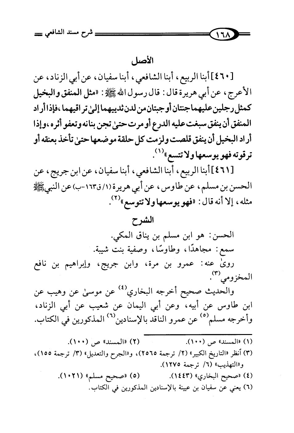 [460] أبنا الربيع، أبنا الشافعي، أبنا سفيان، عن أبي الزناد، عن الأعرج، عن أبي هريرة قال: قال رسول الله - صلى الله عليه وسلم -: "مثل المنفق والبخيل كمثل رجلين عليهما جنتان أو جبتان من لدن ثدييهما إلى تراقيهما، فإذا أراد المنفق أن ينفق سبغت عليه الدرع أو مرت حتى تجن بنانه وتعفو أثره، وإذا أراد البخيل أن ينفق قلصت ولزمت كل حلقة موضعها حتى تأخذ بعنقه أو ترقوته فهو يوسعها ولا تتسع" (¬1).