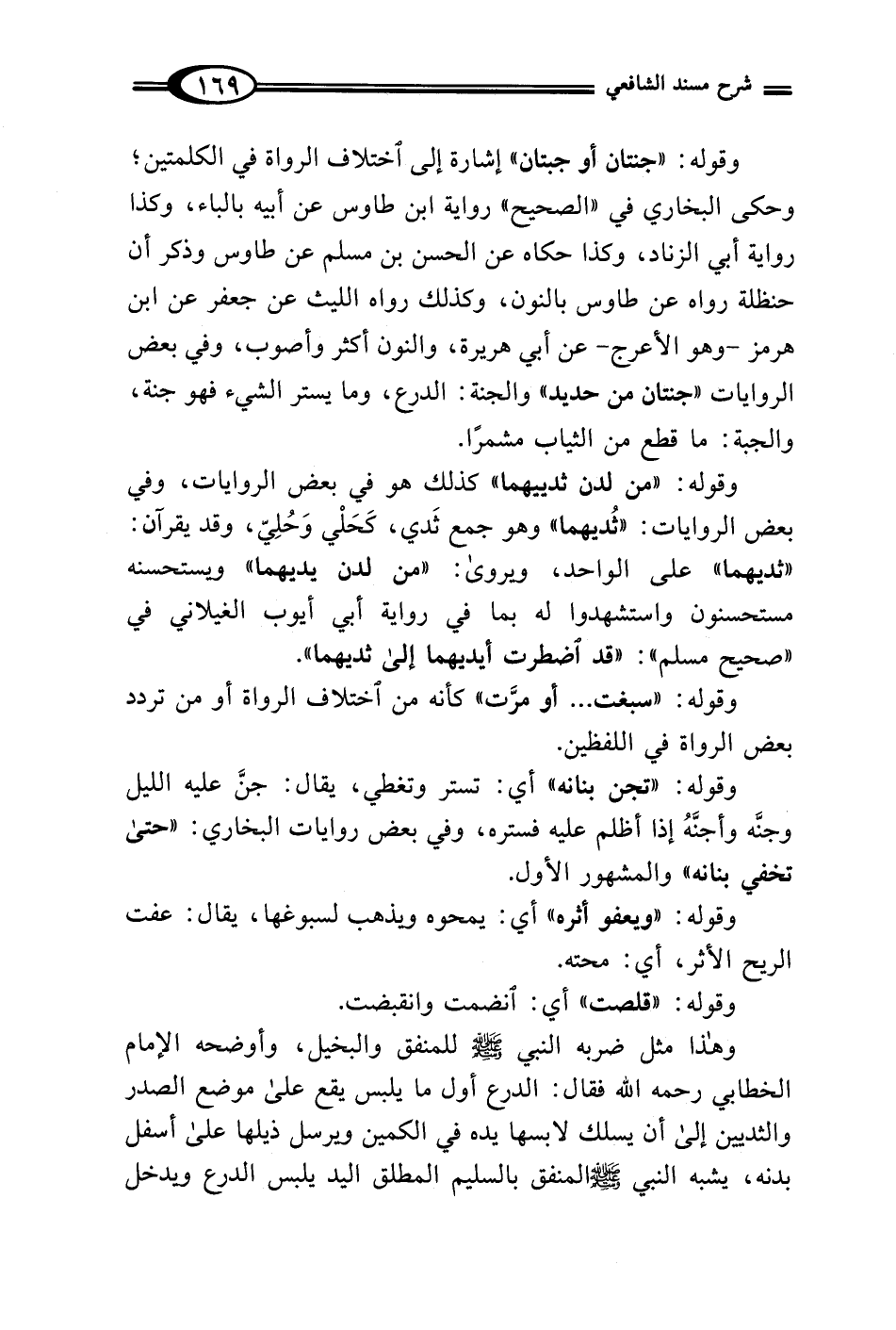 وقوله: "من لدن ثدييهما" كذلك هو في بعض الروايات، وفي بعض الروايات: "ثُديهما" وهو جمع ثَدي، كَحَلْي وَحُلِيّ، وقد يقرآن: "ثديهما" على الواحد، ويروى: "من لدن يديهما" ويستحسنه مستحسنون واستشهدوا له بما في رواية أبي أيوب الغيلاني في "صحيح مسلم": "قد اضطرت أيديهما إلى ثديهما".