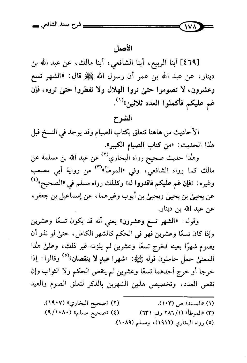 [469] أبنا الربيع، أبنا الشافعي، أبنا مالك، عن عبد الله بن دينار، عن عبد الله بن عمر أن رسول الله - صلى الله عليه وسلم - قال: "الشهر تسع وعشرون، لا تصوموا حتى تروا الهلال ولا تفطروا حتى تروه، فإن غم عليكم فأكملوا العدد ثلاثين" (¬1).