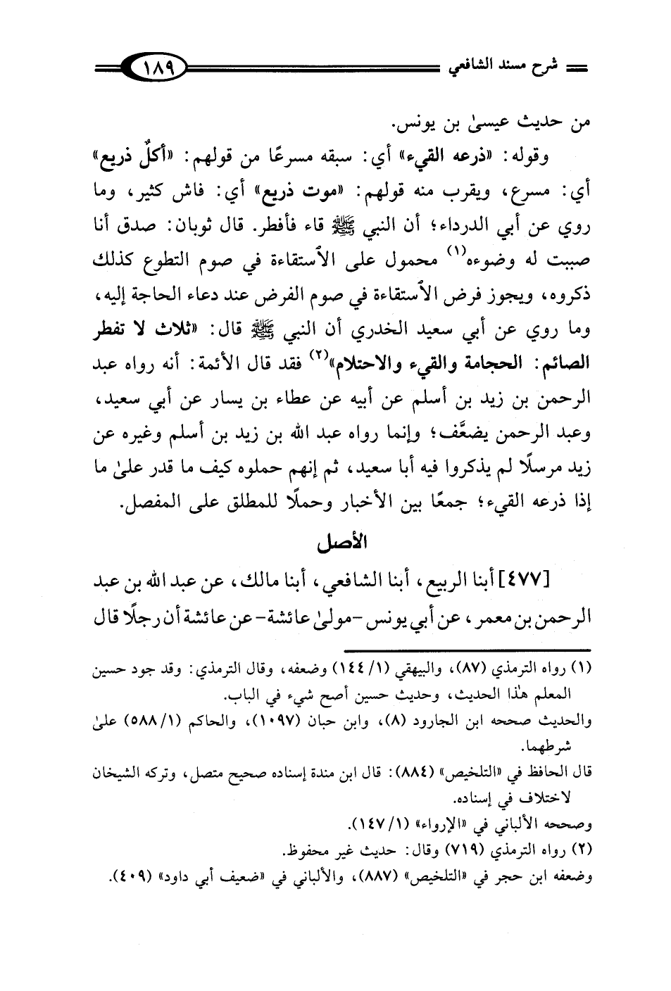 [477] أبنا الربيع، أبنا الشافعي، أبنا مالك، عن عبد الله بن عبد الرحمن بن معمر، عن أبي يونس -مولى عائشة- عن عائشة أن رجلًا قال