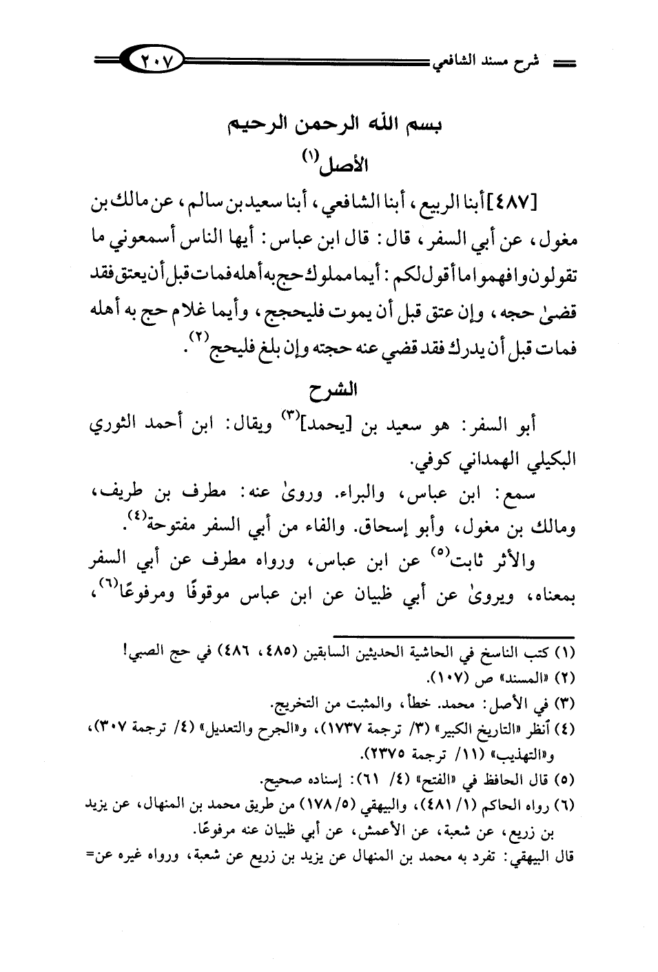 [487] أبنا الربيع، أبنا الشافعي، أبنا سعيد بن سالم، عن مالك بن مغول، عن أبي السفر، قال: قال ابن عباس: أيها الناس أسمعوني ما تقولون وافهموا ما أقول لكم: أيما مملوك حج به أهله فمات قبل أن يعتق فقد قضى حجه، وإن عتق قبل أن يموت فليحجج، وأيما غلام حج به أهله فمات قبل أن يدرك فقد قضي عنه حجته وإن بلغ فليحج (¬2).