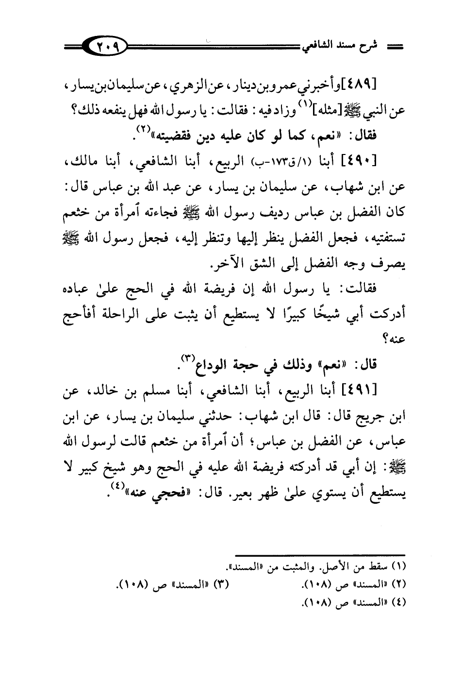 [491] أبنا الربيع، أبنا الشافعي، أبنا مسلم بن خالد، عن ابن جريج قال: قال ابن شهاب: حدثني سليمان بن يسار، عن ابن عباس، عن الفضل بن عباس؛ أن امرأة من خثعم قالت لرسول الله - صلى الله عليه وسلم -: إن أبي قد أدركته فريضة الله عليه في الحج وهو شيخ كبير لا يستطيع أن يستوي على ظهر بعير. قال: "فحجي عنه" (¬4).