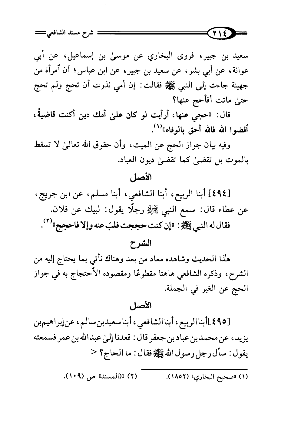 [494] أبنا الربيع، أبنا الشافعي، أبنا مسلم، عن ابن جريج، عن عطاء قال: سمع النبي - صلى الله عليه وسلم - رجلًا يقول: لبيك عن فلان.