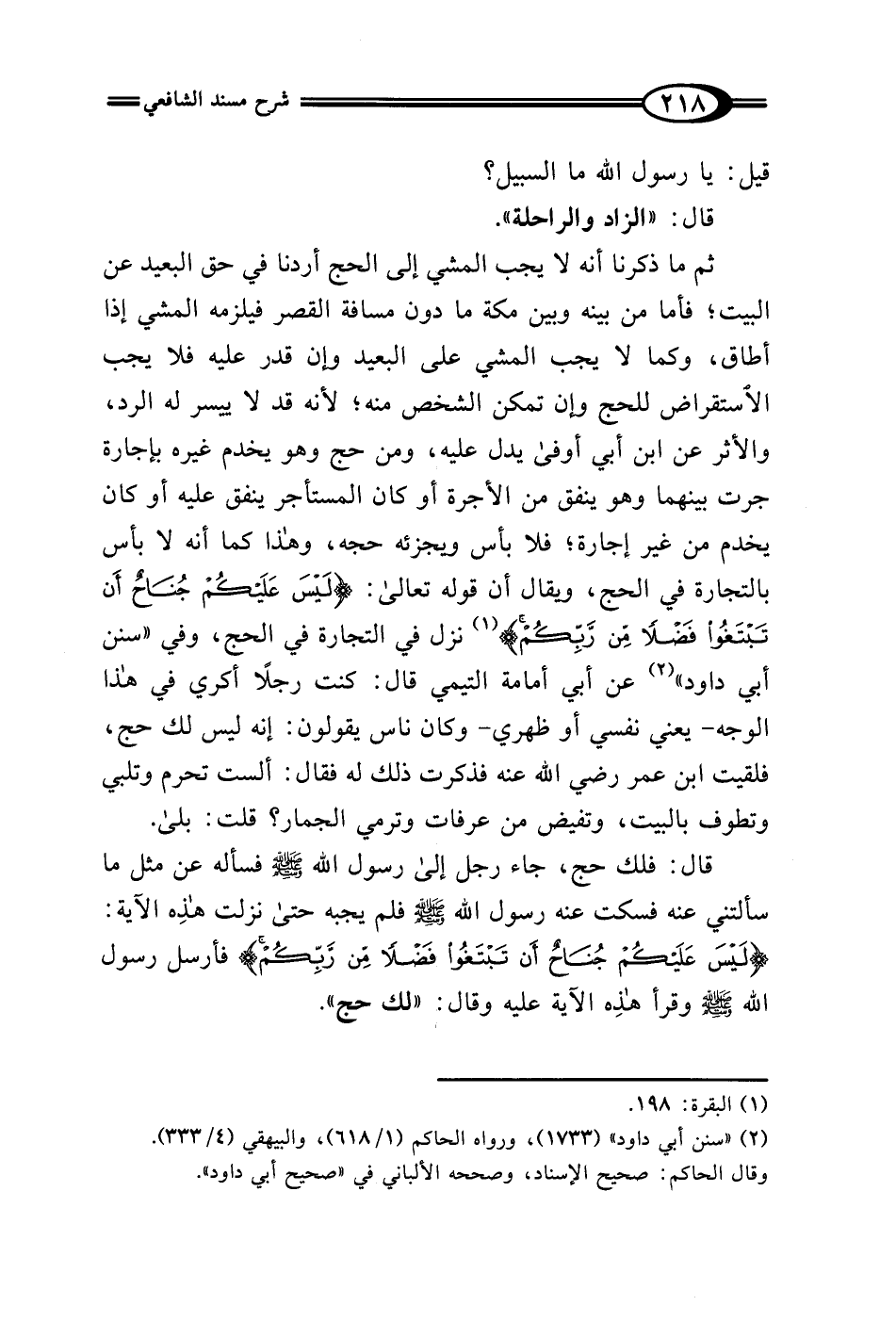 ثم ما ذكرنا أنه لا يجب المشي إلى الحج أردنا في حق البعيد عن البيت؛ فأما من بينه وبين مكة ما دون مسافة القصر فيلزمه المشي إذا أطاق، وكما لا يجب المشي على البعيد وإن قدر عليه فلا يجب الاستقراض للحج وإن تمكن الشخص منه؛ لأنه قد لا ييسر له الرد، والأثر عن ابن أبي أوفى يدل عليه، ومن حج وهو يخدم غيره بإجارة جرت بينهما وهو ينفق من الأجرة أو كان المستأجر ينفق عليه أو كان يخدم من غير إجارة؛ فلا بأس ويجزئه حجه، وهذا كما أنه لا بأس بالتجارة في الحج، ويقال أن قوله تعالى: {لَيْسَ عَلَيْكُمْ جُنَاحٌ أَنْ تَبْتَغُوا فَضْلًا مِنْ رَبِّكُمْ} (¬1) نزل في التجارة في الحج، وفي "سنن أبي داود" (¬2) عن أبي أمامة التيمي قال: كنت رجلًا أكري في هذا الوجه -يعني نفسي أو ظهري- وكان ناس يقولون: إنه ليس لك حج، فلقيت ابن عمر رضي الله عنه فذكرت ذلك له فقال: ألست تحرم وتلبي وتطوف بالبيت، وتفيض من عرفات وترمي الجمار؟ قلت: بلى.