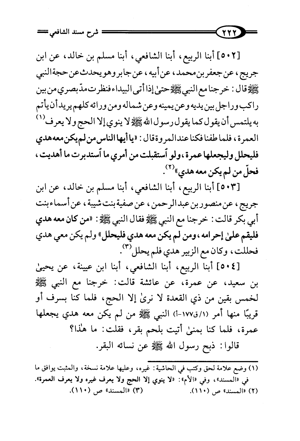 [504] أبنا الربيع، أبنا الشافعي، أبنا ابن عيينة، عن يحيى بن سعيد، عن عمرة، عن عائشة قالت: خرجنا مع النبي - صلى الله عليه وسلم - لخمس بقين من ذي القعدة لا نرى إلا الحج، فلما كنا بسرف أو قريبًا منها أمر النبي - صلى الله عليه وسلم - من لم يكن معه هدي يجعلها عمرة، فلما كنا بمنى أتيت بلحم بقر، فقلت: ما هذا؟