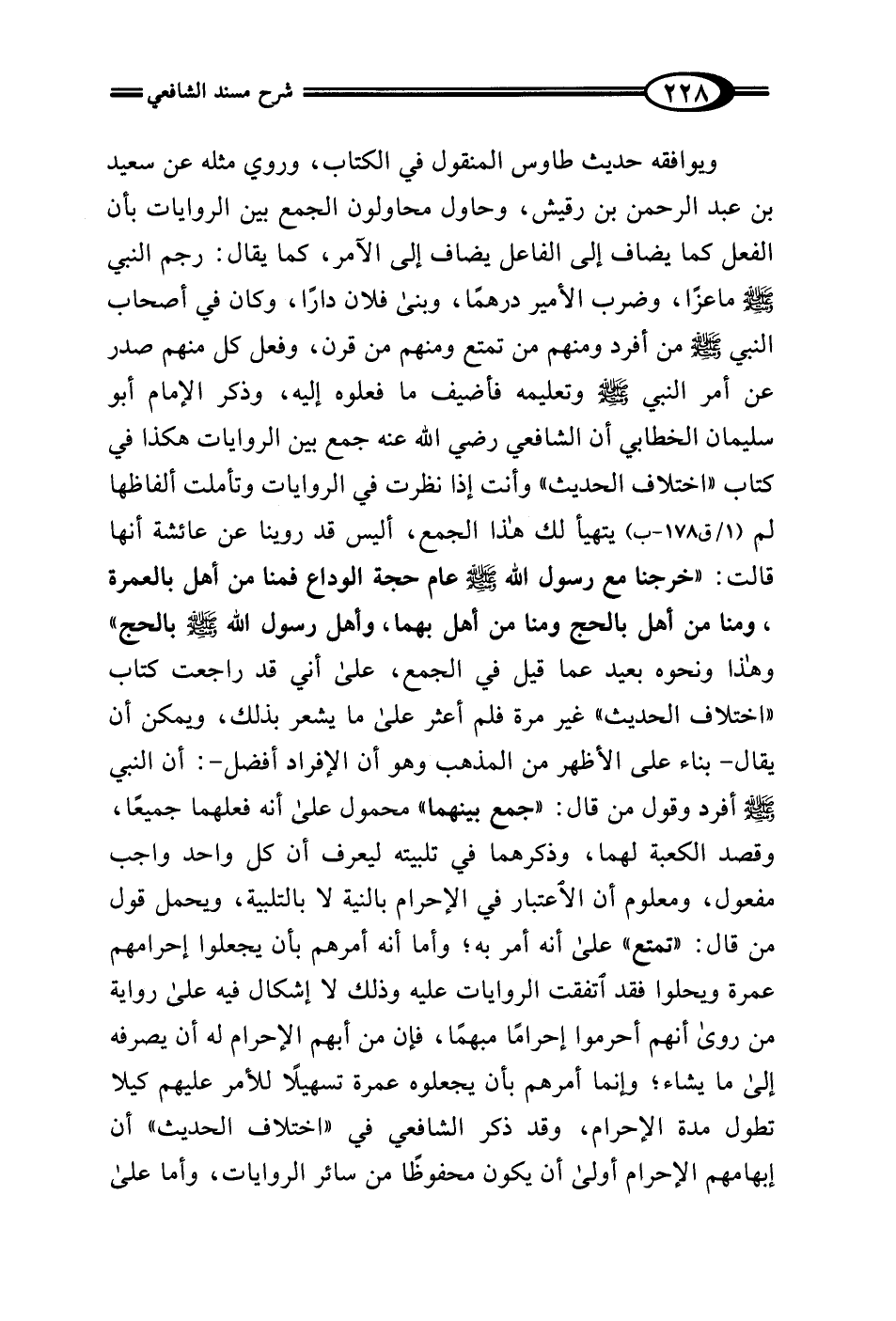 ويوافقه حديث طاوس المنقول في الكتاب، وروي مثله عن سعيد بن عبد الرحمن بن رقيش، وحاول محاولون الجمع بين الروايات بأن الفعل كما يضاف إلى الفاعل يضاف إلى الآمر، كما يقال: رجم النبي - صلى الله عليه وسلم - ماعزًا، وضرب الأمير درهمًا، وبنى فلان دارًا، وكان في أصحاب النبي - صلى الله عليه وسلم - من أفرد ومنهم من تمتع ومنهم من قرن، وفعل كل منهم صدر عن أمر النبي - صلى الله عليه وسلم - وتعليمه فأضيف ما فعلوه إليه، وذكر الإِمام أبو سليمان الخطابي أن الشافعي رضي الله عنه جمع بين الروايات هكذا في كتاب "اختلاف الحديث" وأنت إذا نظرت في الروايات وتأملت ألفاظها لم يتهيأ لك هذا الجمع، أليس قد روينا عن عائشة أنها قالت: "خرجنا مع رسول الله - صلى الله عليه وسلم - عام حجة الودع فمنا من أهل بالعمرة، ومنا من أهل بالحج ومنا من أهل بهما، وأهل رسول الله - صلى الله عليه وسلم - بالحج" وهذا ونحوه بعيد عما قيل في الجمع، على أني قد راجعت كتاب "اختلاف الحديث" غير مرة فلم أعثر على ما يشعر بذلك، ويمكن أن يقال -بناء على الأظهر من المذهب وهو أن الإفراد أفضل-: أن النبي - صلى الله عليه وسلم - أفرد وقول من قال: "جمع بينهما" محمول على أنه فعلهما جميعًا، وقصد الكعبة لهما، وذكرهما في تلبيته ليعرف أن كل واحد واجب مفعول، ومعلوم أن الاعتبار في الإحرام بالنية لا بالتلبية، ويحمل قول من قال: "تمتع" على أنه أمر به؛ وأما أنه أمرهم بأن يجعلوا إحرامهم عمرة ويحلوا فقد اتفقت الروايات عليه وذلك لا إشكال فيه على رواية من روى أنهم أحرموا إحرامًا مبهمًا، فإن من أبهم الإحرام له أن يصرفه إلى ما يشاء؛ وإنما أمرهم بأن يجعلوه عمرة تسهيلًا للأمر عليهم كيلا تطول مدة الإحرام، وقد ذكر الشافعي في "اختلاف الحديث" أن إبهامهم الإحرام أولى أن يكون محفوظًا من سائر الروايات، وأما على