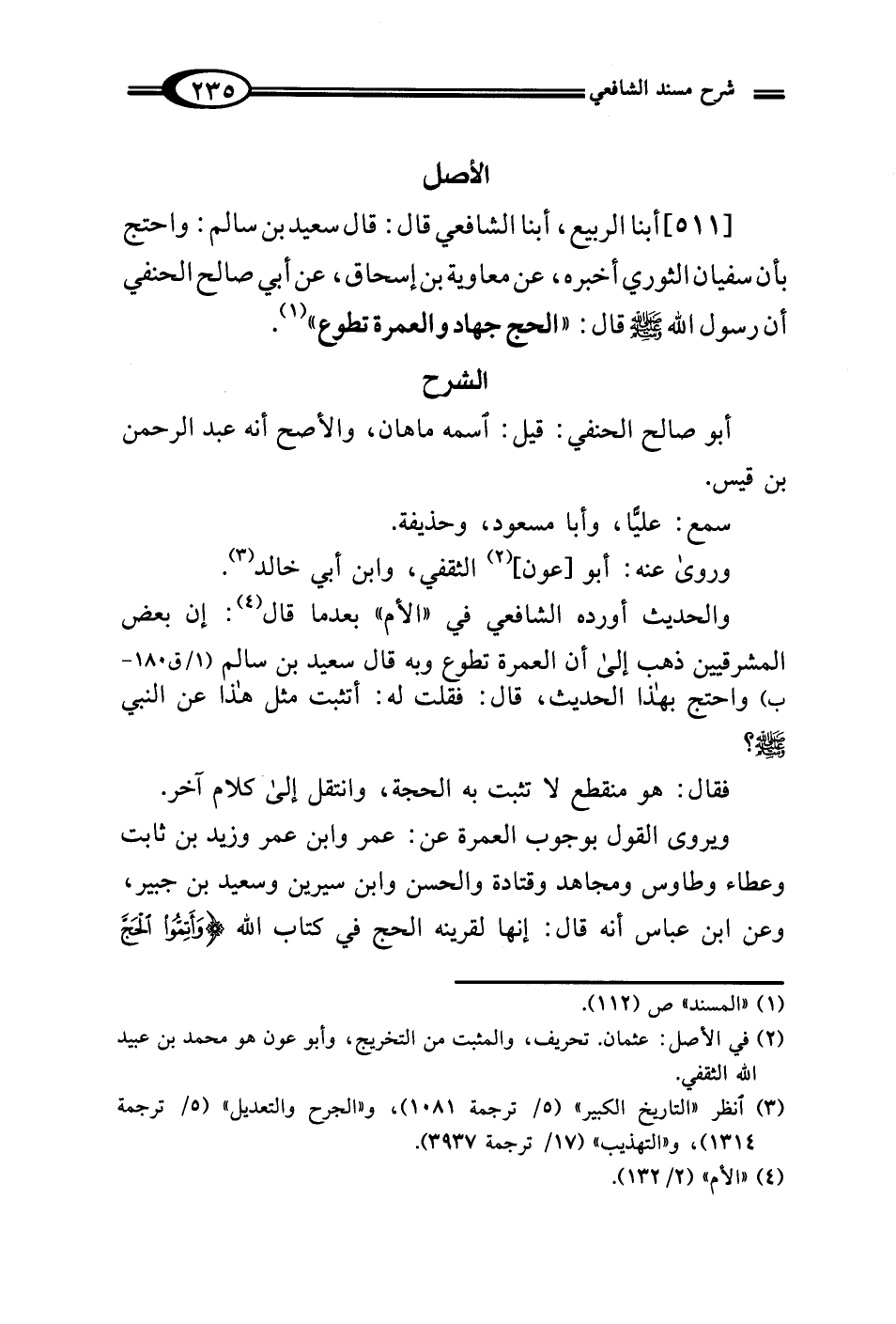 [511] أبنا الربيع، أبنا الشافعي قال: قال سعيد بن سالم: واحتج بأن سفيان الثوري أخبره، عن معاوية بن إسحاق، عن أبي صالح الحنفي أن رسول الله - صلى الله عليه وسلم - قال: "الحج جهاد والعمرة تطوع" (¬1).