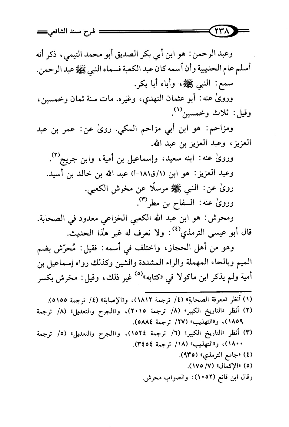 وعبد الرحمن: هو ابن أبي بكر الصديق أبو محمَّد التيمي، ذكر أنه أسلم عام الحديبية وأن اسمه كان عبد الكعبة فسماه النبي - صلى الله عليه وسلم - عبد الرحمن.