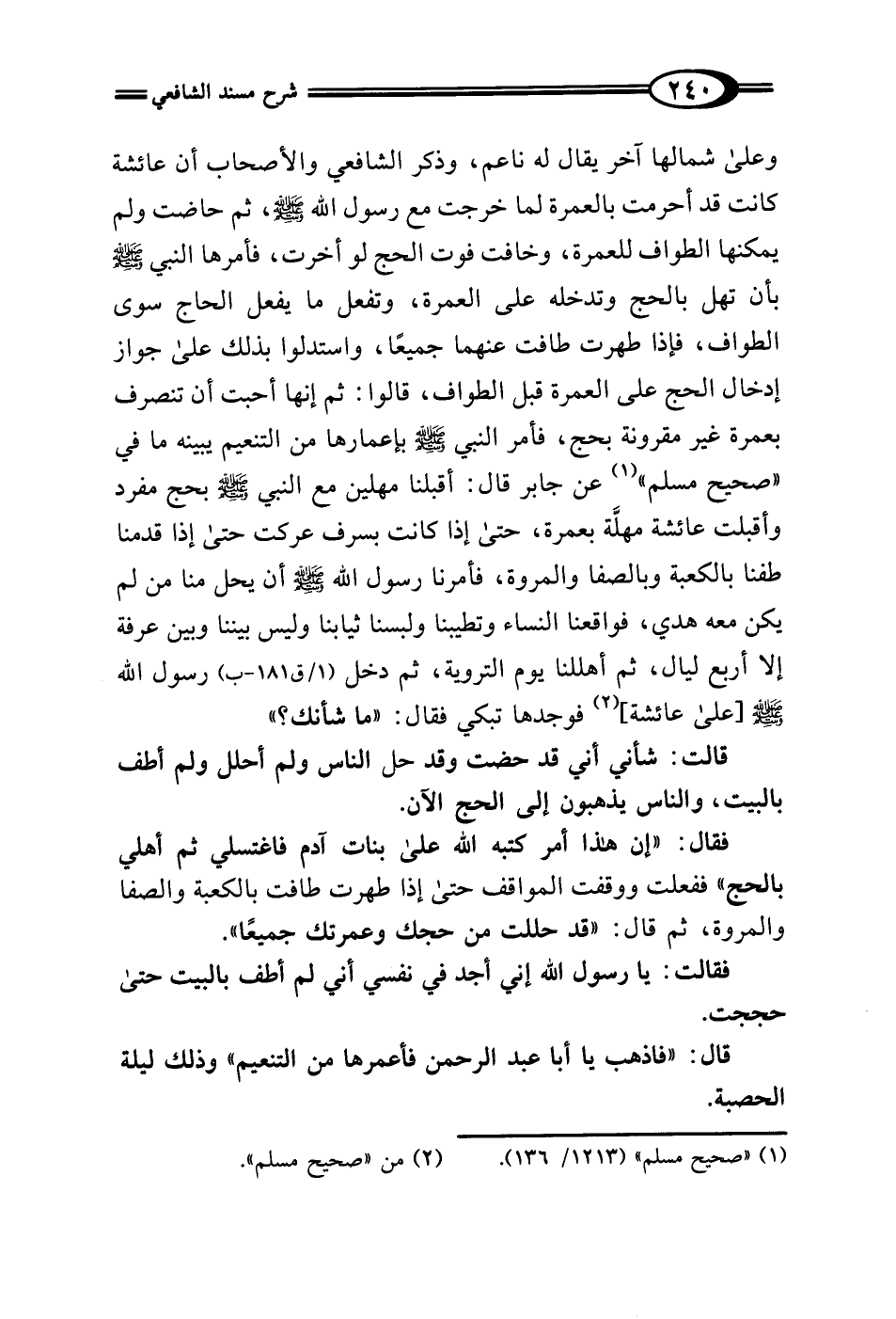 فقال: "إن هذا أمر كتبه الله على بنات آدم فاغتسلي ثم أهلي بالحج" ففعلت ووقفت المواقف حتى إذا طهرت طافت بالكعبة والصفا والمروة، ثم قال: "قد حللت من حجك وعمرتك جميعًا".