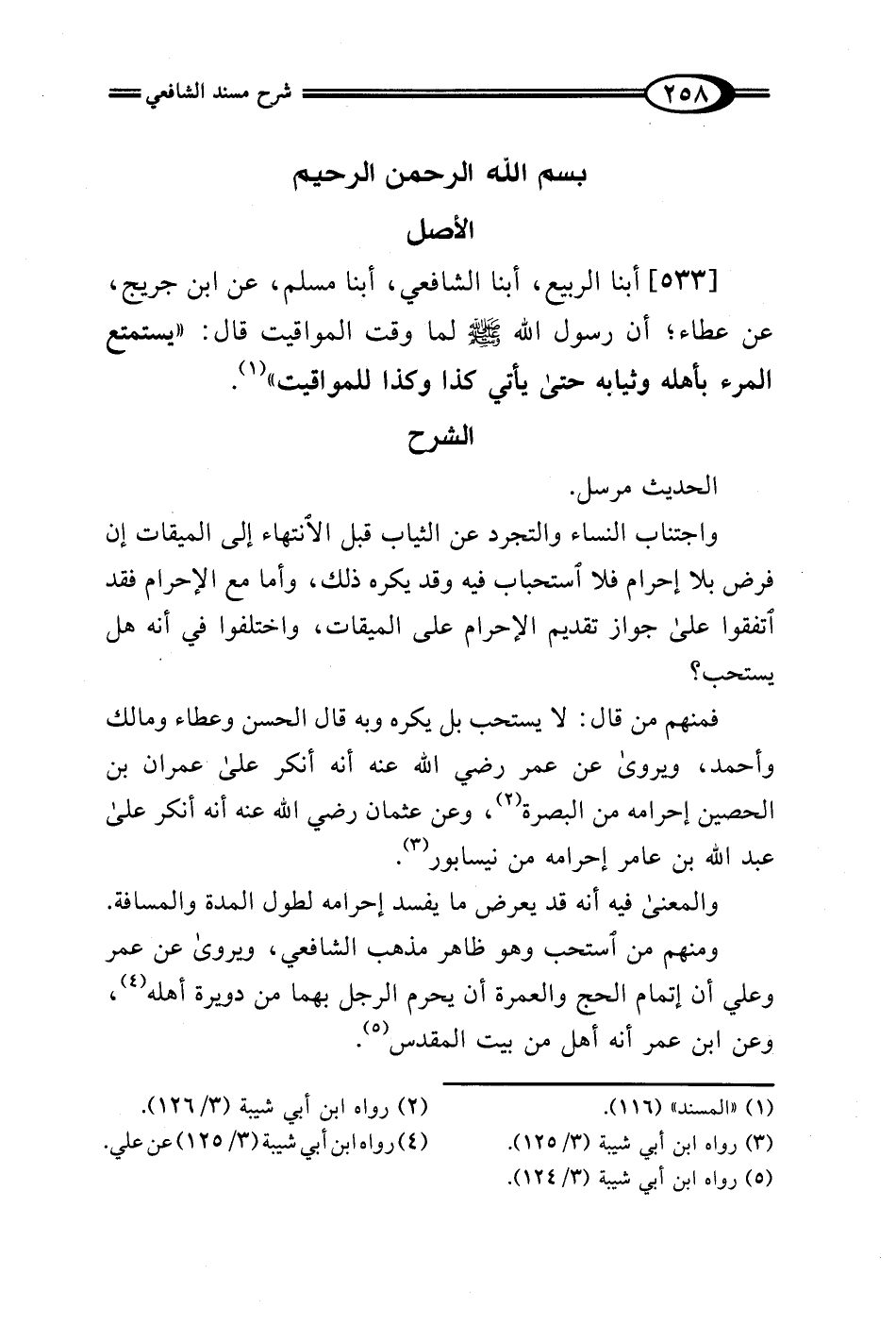 [533] أبنا الربيع، أبنا الشافعي، أبنا مسلم، عن ابن جريج، عن عطاء؛ أن رسول الله - صلى الله عليه وسلم - لما وقت المواقيت قال: "يستمتع المرء بأهله وثيابه حتى يأتي كذا وكذا للمواقيت" (¬1).