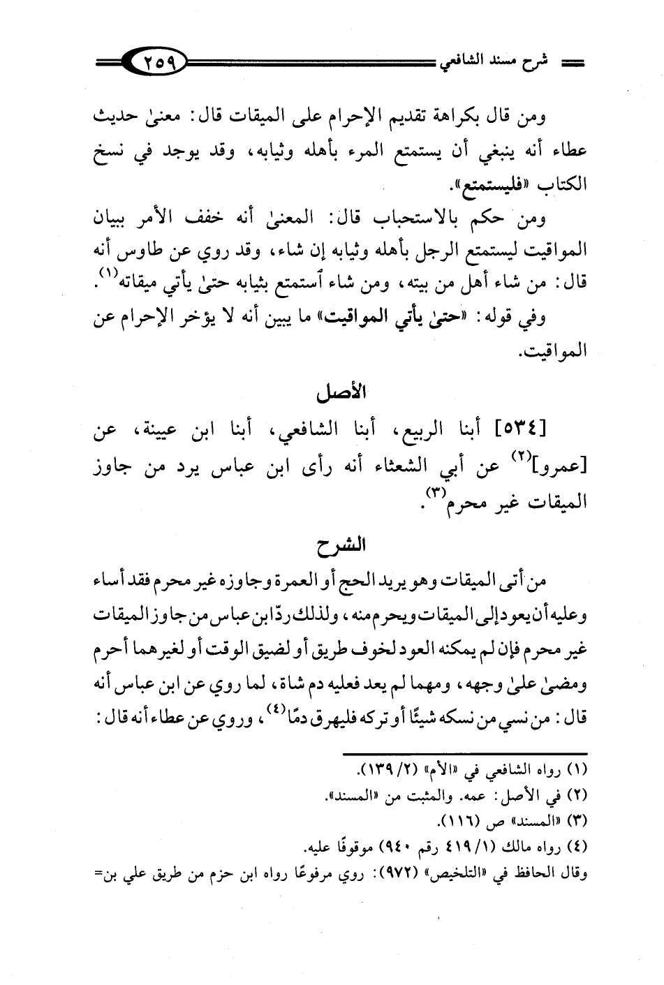 [534] أبنا الربيع، أبنا الشافعي، أبنا ابن عيينة، عن [عمرو] (¬2) عن أبي الشعثاء أنه رأى ابن عباس يرد من جاوز الميقات غير محرم (¬3).