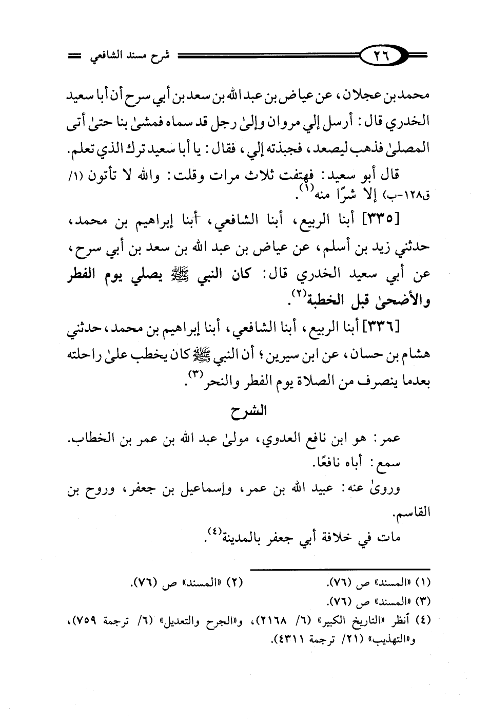[335] أبنا الربيع، أبنا الشافعي، أبنا إبراهيم بن محمَّد، حدثني زيد بن أسلم، عن عياض بن عبد الله بن سعد بن أبي سرح، عن أبي سعيد الخدري قال: كان النبي - صلى الله عليه وسلم - يصلي يوم الفطر والأضحى قبل الخطبة (¬2).
