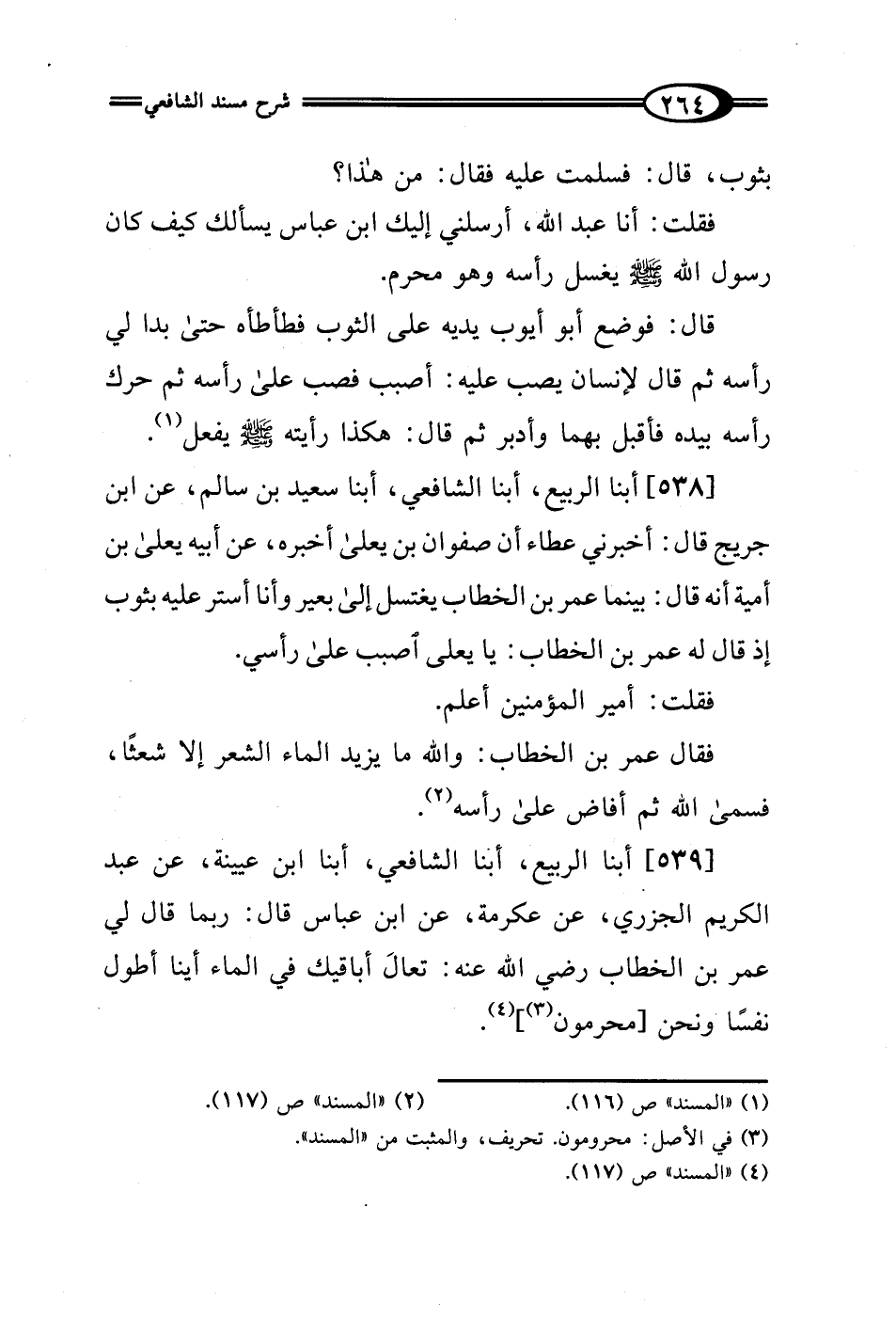 [538] أبنا الربيع، أبنا الشافعي، أبنا سعيد بن سالم، عن ابن جريج قال: أخبرني عطاء أن صفوان بن يعلى أخبره، عن أبيه يعلي بن أمية أنه قال: بينما عمر بن الخطاب يغتسل إلى بعير وأنا أستر عليه بثوب إذ قال له عمر بن الخطاب: يا يعلى اصبب على رأسي.