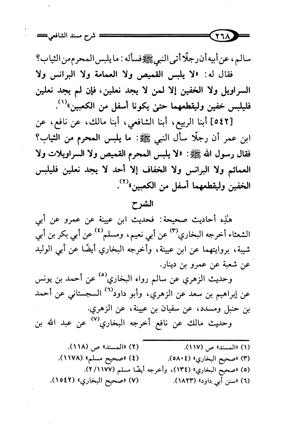 [542] أبنا الربيع، أبنا الشافعي، أبنا مالك، عن نافع، عن ابن عمر أن رجلًا سأل النبي - صلى الله عليه وسلم -: ما يلبس المحرم من الثياب؟ فقال رسول الله - صلى الله عليه وسلم -: "لا يلبس المحرم القميص ولا السراويلات ولا العمائم ولا البرانس ولا الخفاف إلا أحد لا يجد نعلين فليلبس الخفين وليقطعهما أسفل من الكعبين" (¬2).