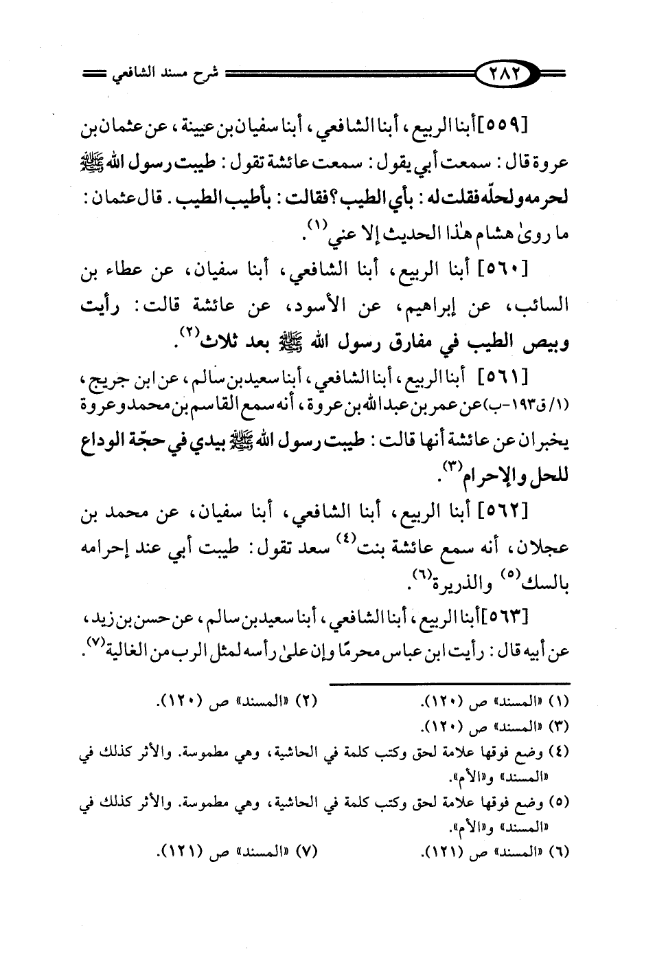 [561] أبنا الربيع، أبنا الشافعي، أبنا سعيد بن سالم، عن ابن جريج، عن عمر بن عبد الله بن عروة، أنه سمع القاسم بن محمَّد وعروة يخبران عن عائشة أنها قالت: طيبت رسول الله - صلى الله عليه وسلم - بيدي في حجّة الوداع للحل والإحرام (¬3).