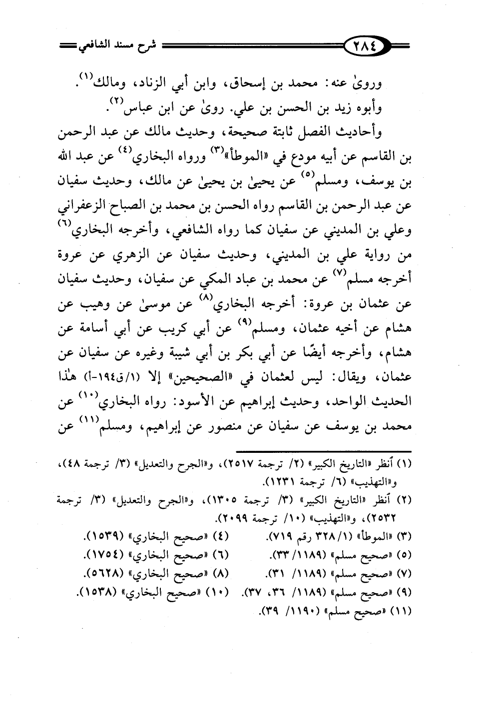 وأحاديث الفصل ثابتة صحيحة، وحديث مالك عن عبد الرحمن بن القاسم عن أبيه مودع في "الموطأ" (¬3) ورواه البخاري (¬4) عن عبد الله بن يوسف، ومسلم (¬5) عن يحيى بن يحيى عن مالك، وحديث سفيان عن عبد الرحمن بن القاسم رواه الحسن بن محمَّد بن الصباح الزعفراني وعلي بن المديني عن سفيان كما رواه الشافعي، وأخرجه البخاري (¬6) من رواية علي بن المديني، وحديث سفيان عن الزهري عن عروة أخرجه مسلم (¬7) عن محمَّد بن عباد المكي عن سفيان، وحديث سفيان عن عثمان بن عروة: أخرجه البخاري (¬8) عن موسى عن وهيب عن هشام عن أخيه عثمان، ومسلم (¬9) عن أبي كريب عن أبي أسامة عن هشام، وأخرجه أيضًا عن أبي بكر بن أبي شيبة وغيره عن سفيان عن عثمان، ويقال: ليس لعثمان في "الصحيحين" إلا هذا الحديث الواحد، وحديث إبراهيم عن الأسود: رواه البخاري (¬10) عن محمَّد بن يوسف عن سفيان عن منصور عن إبراهيم، ومسلم (¬11) عن