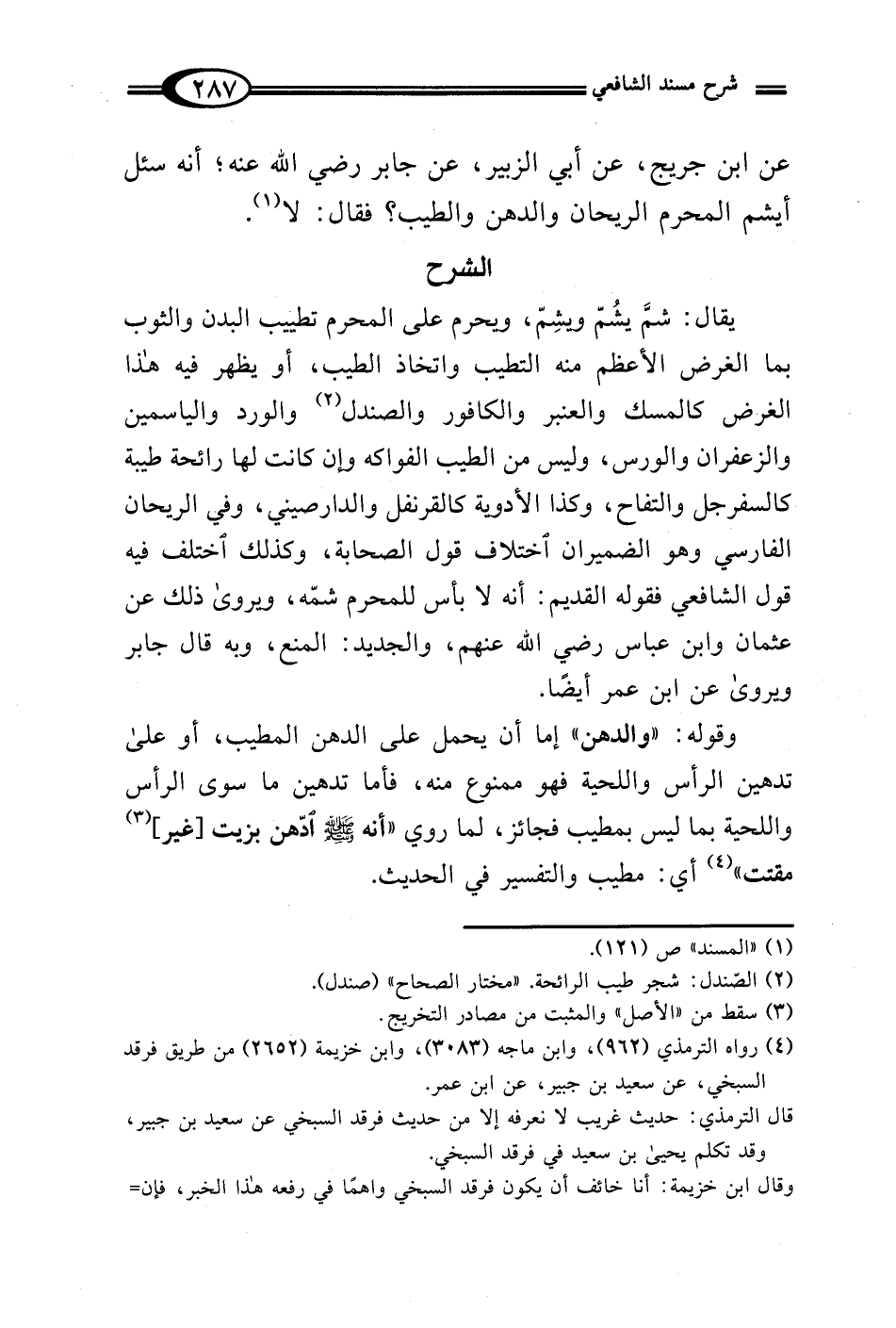 يقال: شمَّ يشُمّ ويشِمّ، ويحرم على المحرم تطييب البدن والثوب بما الغرض الأعظم منه التطيب واتخاذ الطيب، أو يظهر فيه هذا الغرض كالمسك والعنبر والكافور والصندل (¬2) والورد والياسمين والزعفران والورس، وليس من الطيب الفواكه وإن كانت لها رائحة طيبة كالسفرجل والتفاح، وكذا الأدوية كالقرنفل والدارصيني، وفي الريحان الفارسي وهو الضميران اختلاف قول الصحابة، وكذلك اختلف فيه قول الشافعي فقوله القديم: أنه لا بأس للمحرم شمّه، ويروى ذلك عن عثمان وابن عباس رضي الله عنهم، والجديد: المنع، وبه قال جابر ويروى عن ابن عمر أيضًا.