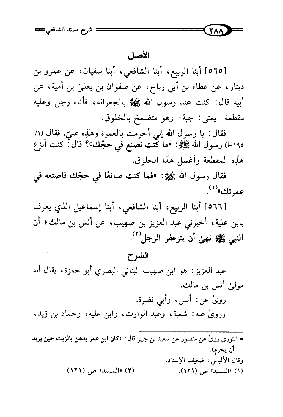 [566] أبنا الربيع، أبنا الشافعي، أبنا إسماعيل الذي يعرف بابن علية، أخبرني عبد العزيز بن صهيب، عن أنس بن مالك؛ أن النبي - صلى الله عليه وسلم - نهى أن يتزعفر الرجل (¬2).