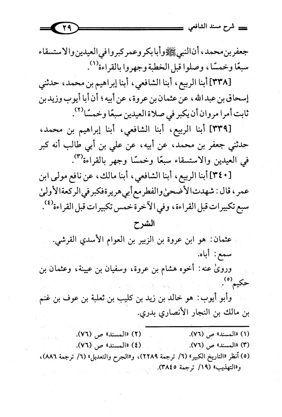 [338] أبنا الربيع، أبنا الشافعي، أبنا إبراهيم بن محمَّد، حدثني إسحاق بن عبد الله، عن عثمان بن عروة، عن أبيه؛ أن أبا أيوب وزيد بن ثابت أمرا مروان أن يكبر في صلاة العيدين سبعًا وخمسًا (¬2).