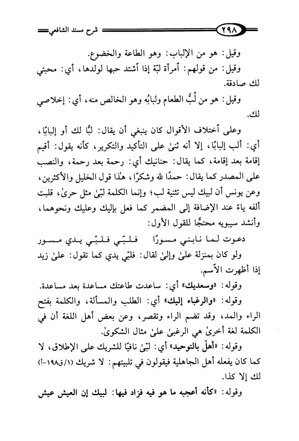 وعلى اختلاف الأقوال كان ينبغي أن يقال: لبًّا لك أو إلبابًا، أي: ألب إلبابًا، إلا أنه ثنى على التأكيد والتكرير، كأنه يقول: أقيم إقامة بعد إقامة، كما يقال: حنانيك أي: رحمة بعد رحمة، والنصب على المصدر كما يقال: حمدًا لله وشكرًا، هذا قول الخليل والأكثرين، وعن يونس أن لبيك ليس تثنية لب؛ وإنما الكلمة لبّى مثل حرى، قلبت ألفه ياءً عند الإضافة إلى المضمر كما فعل بإليك وعليك ونحوهما، وأنشد سيبويه محتجًّا للقول الأول: