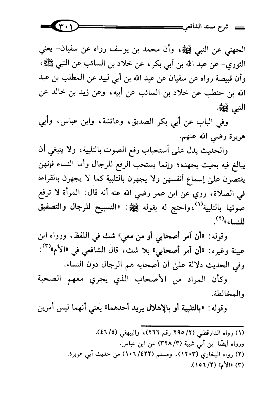والحديث يدل على استحباب رفع الصوت بالتلبية، ولا ينبغي أن يبالغ فيه بحيث يجهده؛ وإنما يستحب الرفع للرجال وأما النساء فإنهن يقتصرن على إسماع أنفسهن ولا يجهرن بالتلبية كما لا يجهرن بالقراءة في الصلاة، روي عن ابن عمر رضي الله عنه أنه قال: المرأة لا ترفع صوتها بالتلبية (¬1)، واحتج له بقوله - صلى الله عليه وسلم -: "التسبيح للرجال والتصفيق للنساء" (¬2).