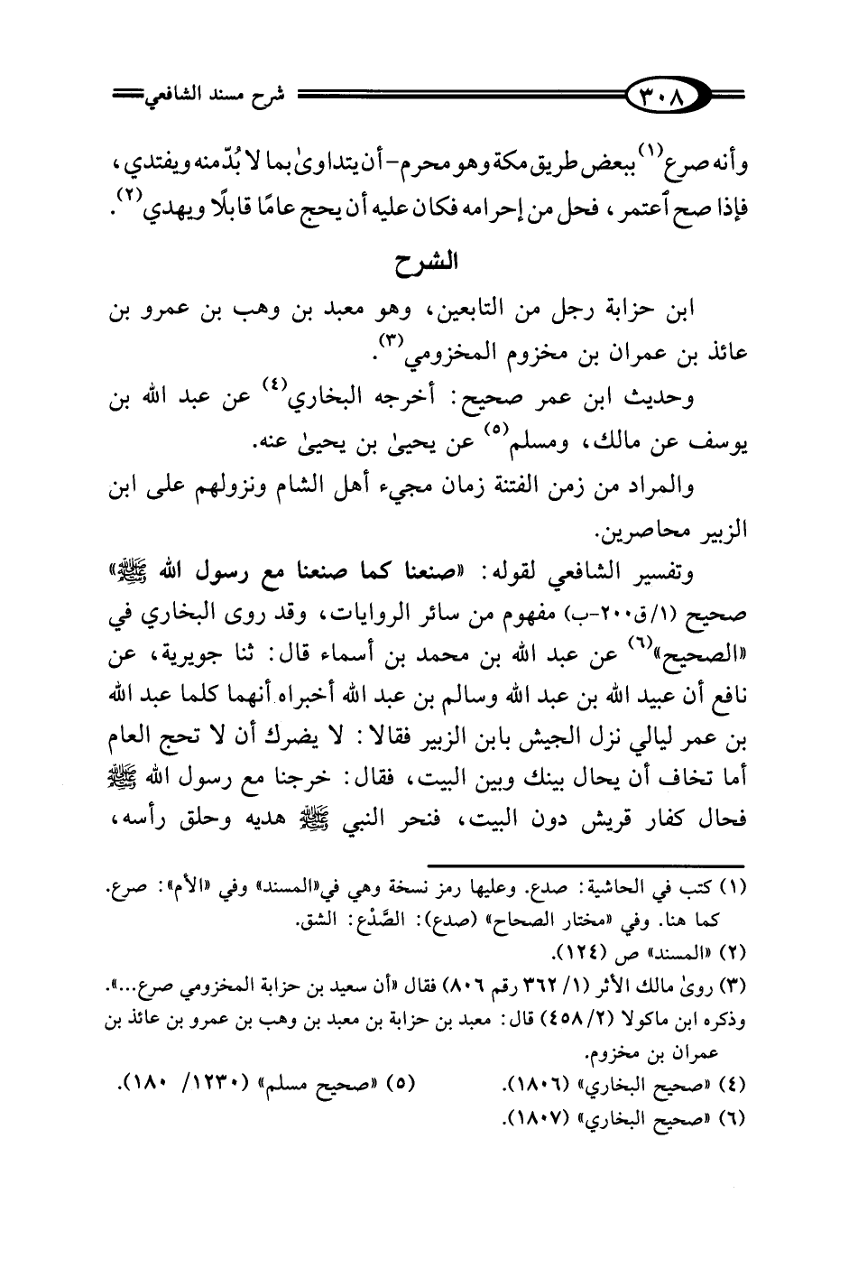 وتفسير الشافعي لقوله: "صنعنا كما صنعنا مع رسول الله - صلى الله عليه وسلم - صحيح ما مفهوم من سائر الروايات، وقد روى البخاري في "الصحيح" (¬6) عن عبد الله بن محمَّد بن أسماء قال: ثنا جويرية، عن نافع أن عبيد الله بن عبد الله وسالم بن عبد الله أخبراه أنهما كلما عبد الله بن عمر ليالي نزل الجيش بابن الزبير فقالا: لا يضرك أن لا تحج العام أما تخاف أن يحال بينك وبين البيت، فقال: خرجنا مع رسول الله - صلى الله عليه وسلم - فحال كفار قريش دون البيت، فنحر النبي - صلى الله عليه وسلم - هديه وحلق رأسه،