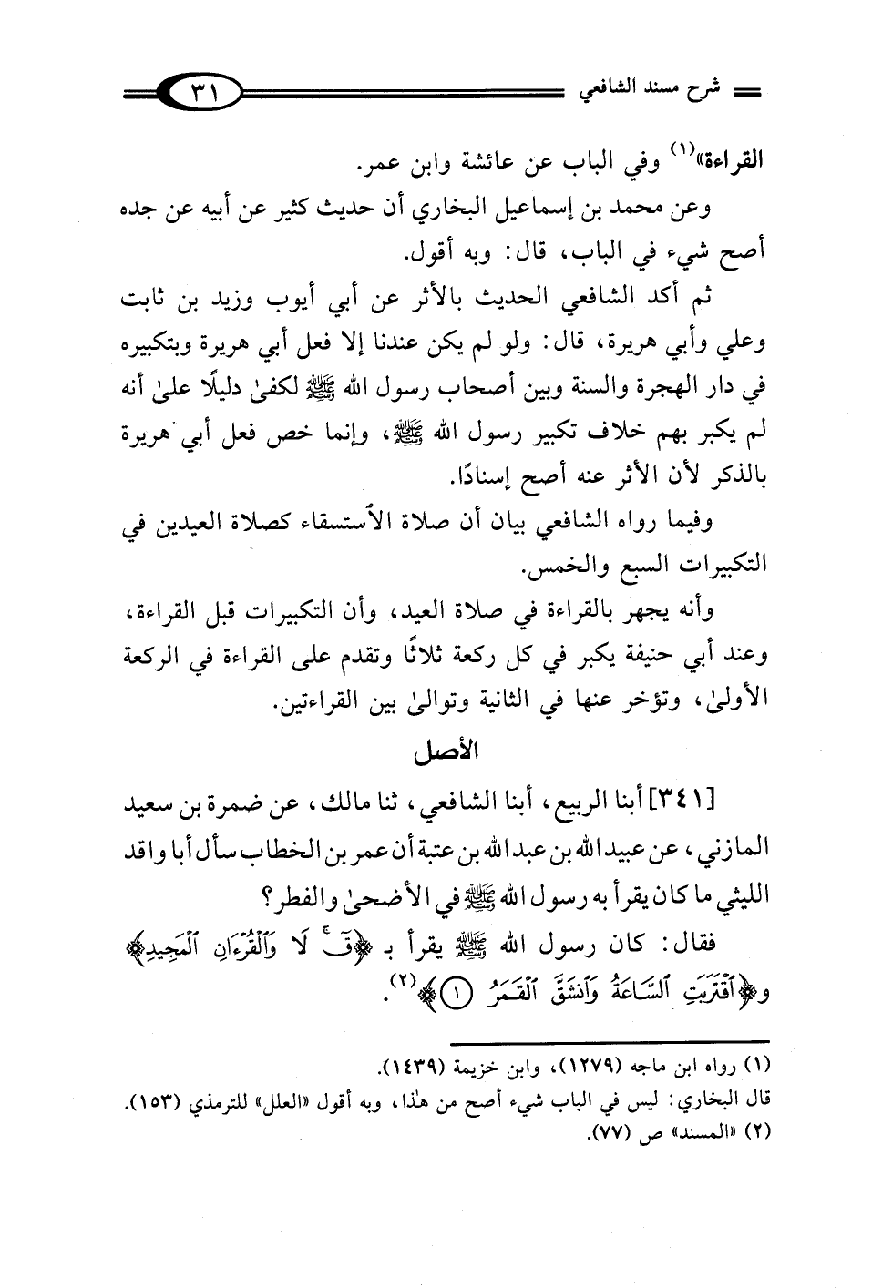 [341] أبنا الربيع، أبنا الشافعي، ثنا مالك، عن ضمرة بن سعيد المازني، عن عبيد الله بن عبد الله بن عتبة أن عمر بن الخطاب سأل أبا واقد الليثي ما كان يقرأ به رسول الله - صلى الله عليه وسلم - في الأضحى والفطر؟