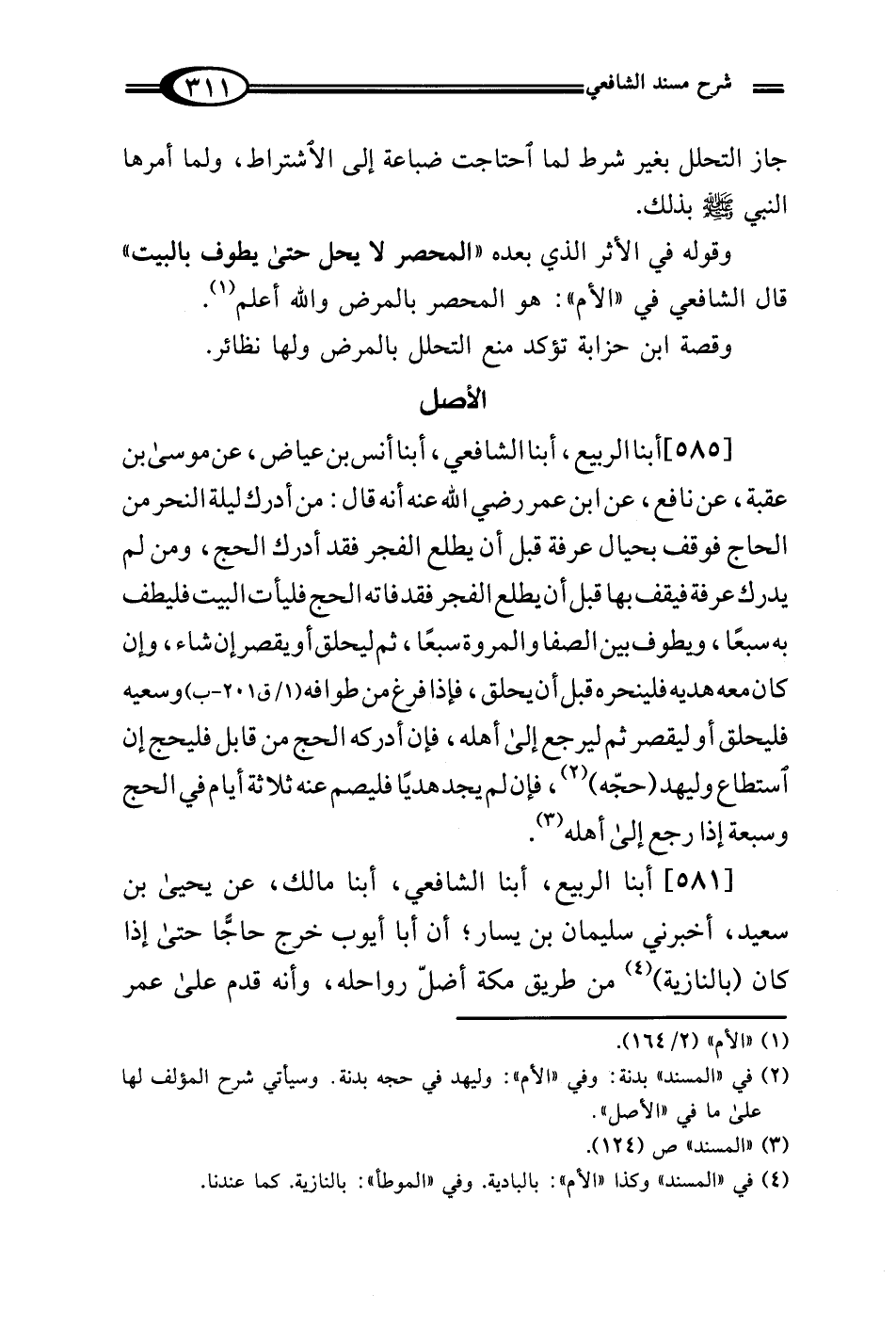 [585] أبنا الربيع، أبنا الشافعي، أبنا أنس بن عياض، عن موسى بن عقبة، عن نافع، عن ابن عمر رضي الله عنه أنه قال: من أدرك ليلة النحر من الحاج فوقف بحيال عرفة قبل أن يطلع الفجر فقد أدرك الحج، ومن لم يدرك عرفة فيقف بها قبل أن يطلع الفجر فقد فاته الحج فليأت البيت فليطف به سبعًا، ويطوف بين الصفا والمروة سبعًا، ثم ليحلق أو يقصر إن شاء، وإن كان معه هديه فلينحره قبل أن يحلق، فإذا فرغ من طوافه وسعيه فليحلق أو ليقصر ثم ليرجع إلى أهله، فإن أدركه الحج من قابل فليحج إن استطاع وليهد (حجّه) (¬2)، فإن لم يجد هديًا فليصم عنه ثلاثة أيام في الحج وسبعة إذا رجع إلى أهله (¬3).