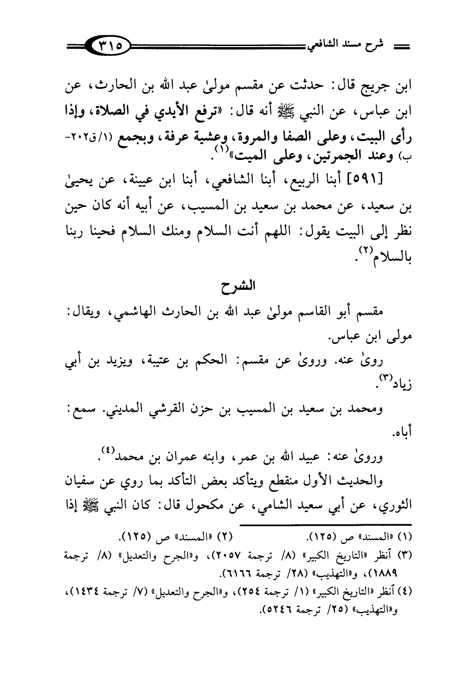 [591] أبنا الربيع، أبنا الشافعي، أبنا ابن عيينة، عن يحيى بن سعيد، عن محمَّد بن سعيد بن المسيب، عن أبيه أنه كان حين نظر إلى البيت يقول: اللهم أنت السلام ومنك السلام فحينا ربنا بالسلام (¬2).