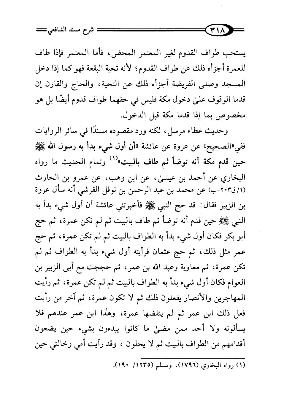 وحديث عطاء مرسل، لكنه ورد مقصوده مسندًا في سائر الروايات ففي "الصحيح" عن عروة عن عائشة "أن أول شيء بدأ به رسول الله - صلى الله عليه وسلم - حين قدم مكة أنه توضأ ثم طاف بالبيت" (¬1) وتمام الحديث ما رواه البخاري عن أحمد بن عيسى، عن ابن وهب، عن عمرو بن الحارث عن محمَّد بن عبد الرحمن بن نوفل القرشي أنه سأل عروة بن الزبير فقال: قد حج النبي - صلى الله عليه وسلم - فأخبرتني عائشة أن أول شيء بدأ به النبي - صلى الله عليه وسلم - حين قدم أنه توضأ ثم طاف بالبيت ثم لم تكن عمرة، ثم حج أبو بكر فكان أول شيء بدأ به الطواف بالبيت ثم لم تكن عمرة، ثم حج عمر مثل ذلك، ثم حج عثمان فرأيته أول شيء بدأ به الطواف ثم لم تكن عمرة، ثم معاوية وعبد الله بن عمر، ثم حججت مع أبى الزبير بن العوام فكان أول شيء بدأ به الطواف بالبيت ثم لم تكن عمرة، ثم رأيت المهاجرين والأنصار يفعلون ذلك ثم لا تكون عمرة، ثم آخر من رأيت فعل ذلك ابن عمر ثم لم ينقضها عمرة، وهذا ابن عمر عندهم فلا يسألونه ولا أحد ممن مضى ما كانوا يبدءون بشيء حين يضعون أقدامهم من الطواف بالبيت ثم لا يحلون، وقد رأيت أمي وخالتي حين