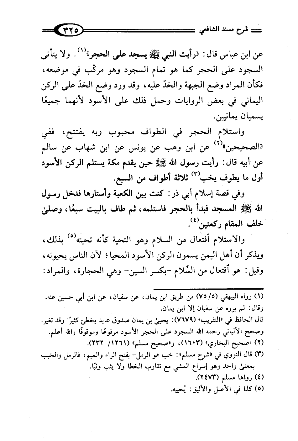 عن ابن عباس قال: "رأيت النبي - صلى الله عليه وسلم - يسجد على الحجر" (¬1). ولا يتأتى السجود على الحجر كما هو تمام السجود وهو مركّب في موضعه، فكأن المراد وضع الجبهة والخدّ عليه، وقد ورد وضع الخدّ على الركن اليماني في بعض الروايات وحمل ذلك على الأسود لأنهما جميعًا يسميان يمانيين.