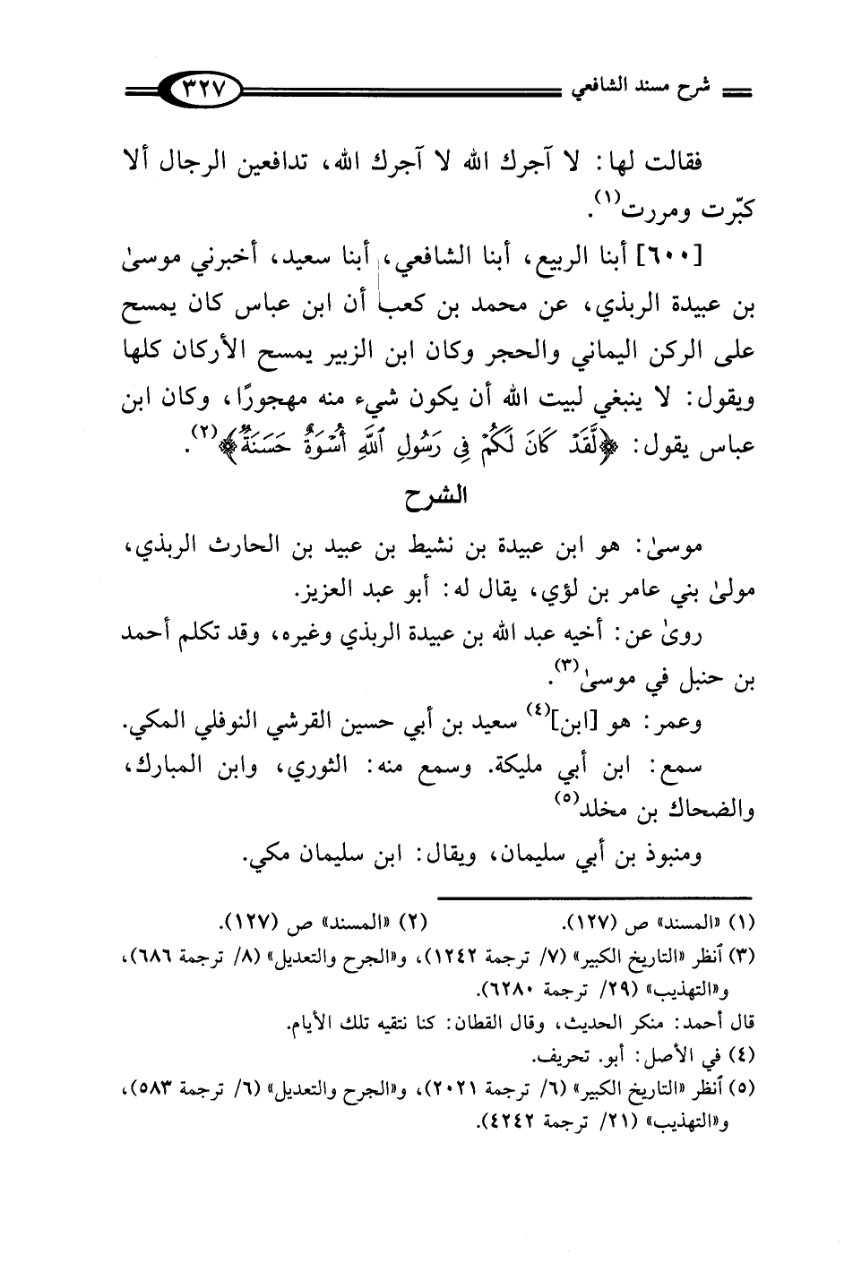 [600] أبنا الربيع، أبنا الشافعي، أبنا سعيد، أخبرني موسى بن عبيدة الربذي، عن محمَّد بن كعب أن ابن عباس كان يمسح على الركن اليماني والحجر وكان ابن الزبير يمسح الأركان كلها ويقول: لا ينبغي لبيت الله أن يكون شيء منه مهجورًا، وكان ابن عباس يقول: {لَقَدْ كَانَ لَكُمْ في رَسُولِ اللهِ أُسْوَةٌ حَسَنَةٌ} (¬2).