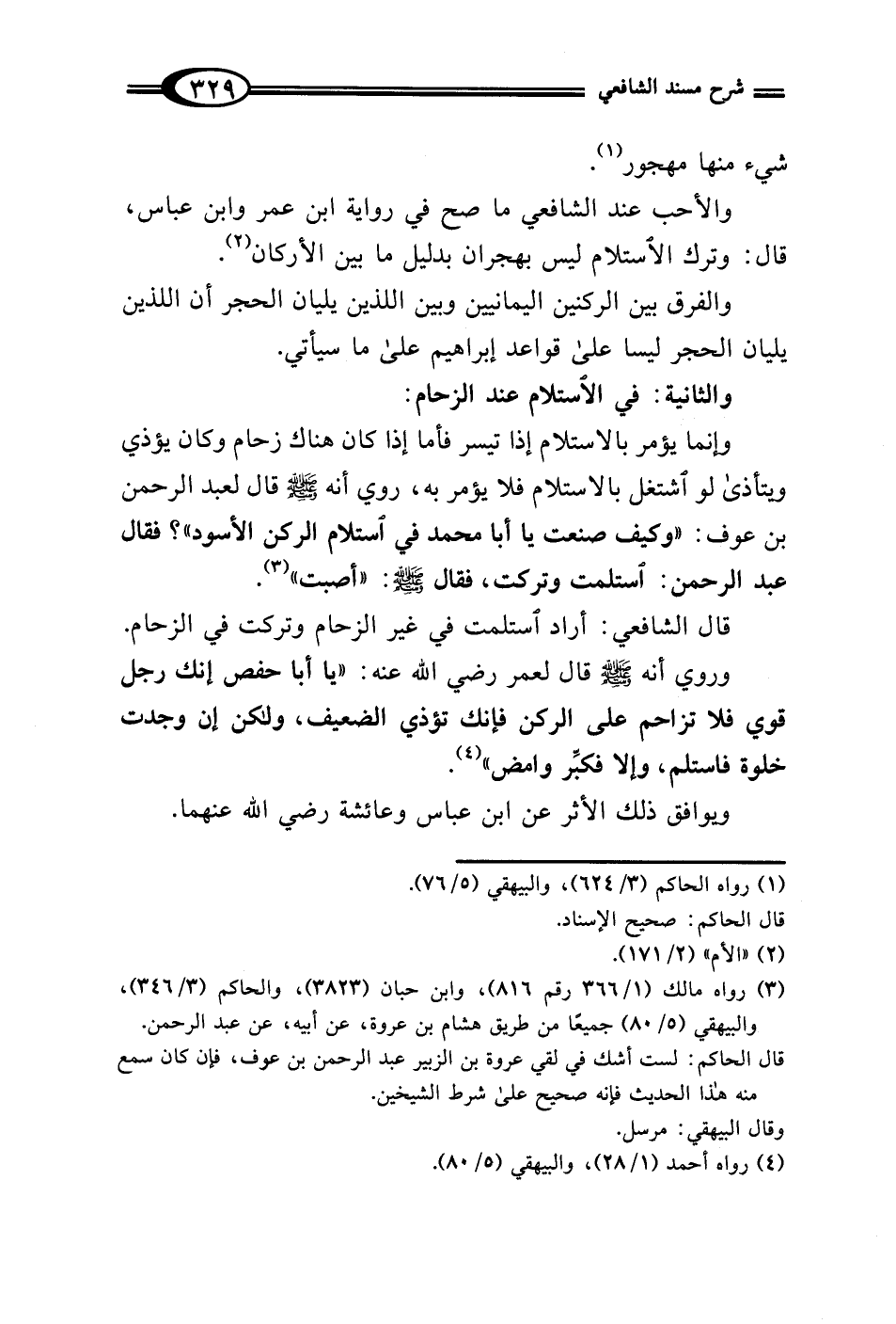 والأحب عند الشافعي ما صح في رواية ابن عمر وابن عباس، قال: وترك الاستلام ليس بهجران بدليل ما بين الأركان (¬2).