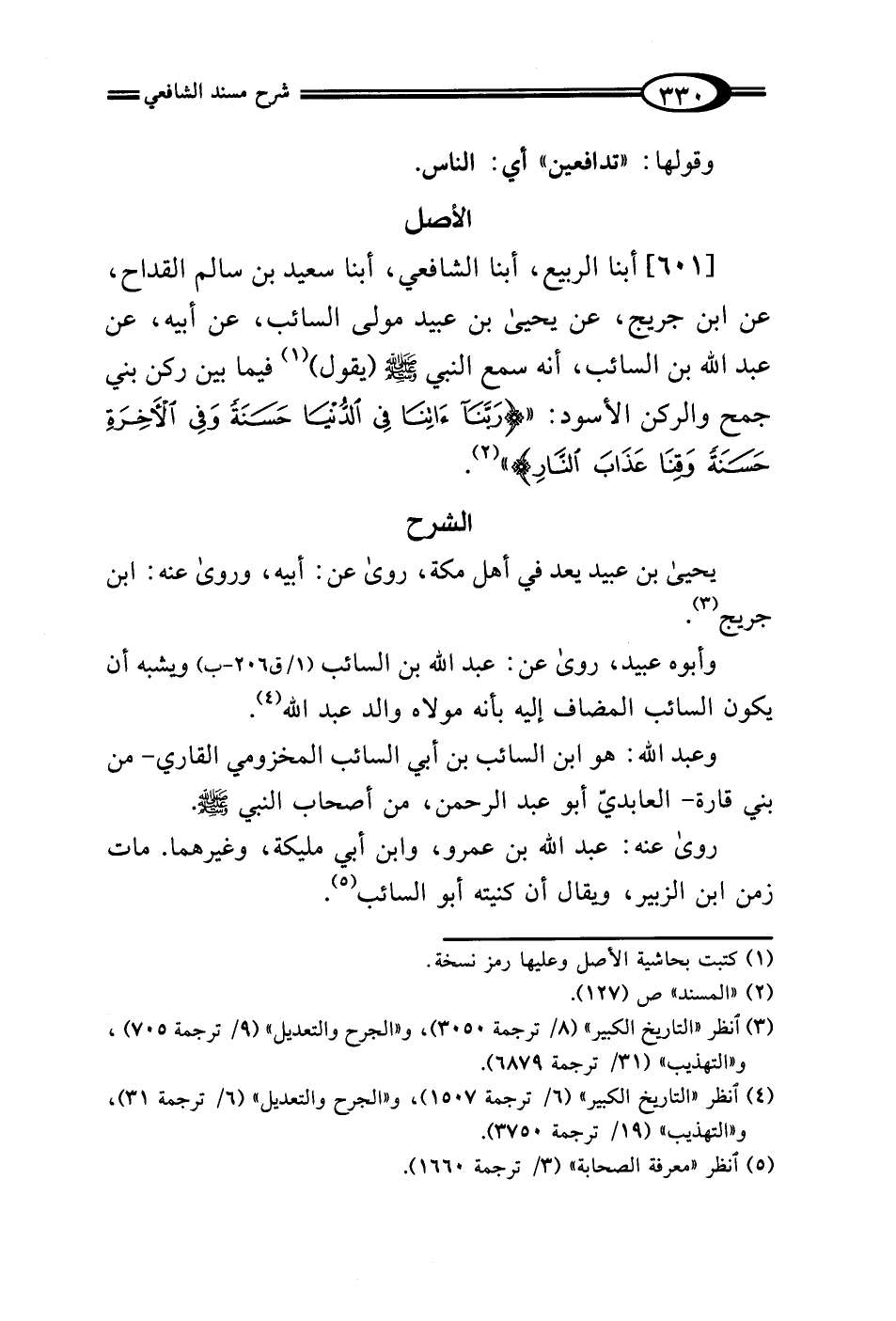 [601] أبنا الربيع، أبنا الشافعي، أبنا سعيد بن سالم القداح، عن ابن جريج، عن يحيى بن عبيد مولى السائب، عن أبيه، عن عبد الله بن السائب، أنه سمع النبي - صلى الله عليه وسلم - (يقول) (¬1) فيما بين ركن بني جمح والركن الأسود: " {رَبَّنَا آتِنَا في الدُّنْيَا حَسَنَةً وَفِي الْآخِرَةِ حَسَنَةً وَقِنَا عَذَابَ النَّارِ} " (¬2).