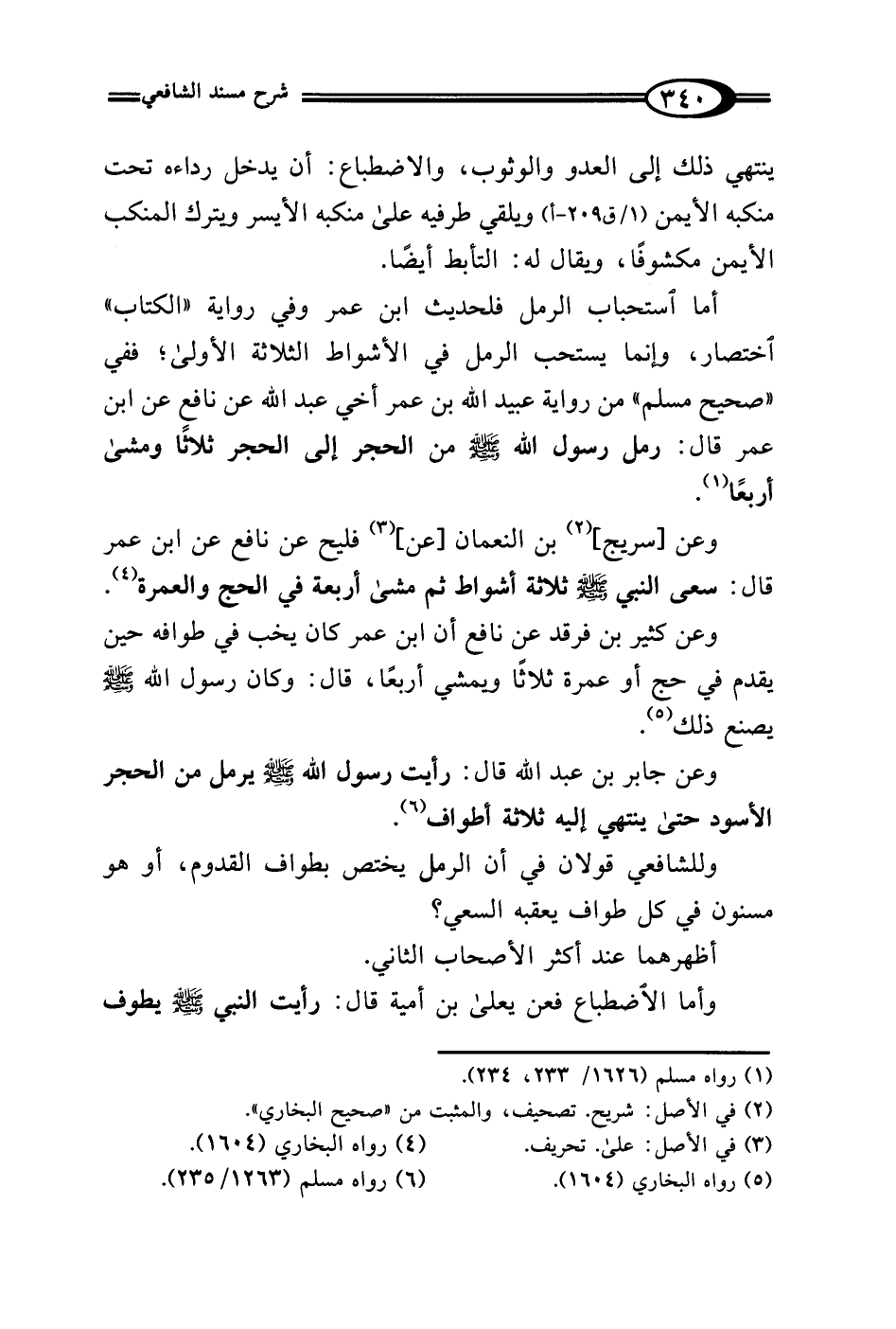ينتهي ذلك إلى العدو والوثوب، والاضطباع: أن يدخل رداءه تحت منكبه الأيمن ويلقي طرفيه على منكبه الأيسر ويترك المنكب الأيمن مكشوفًا، ويقال له: التأبط أيضًا.