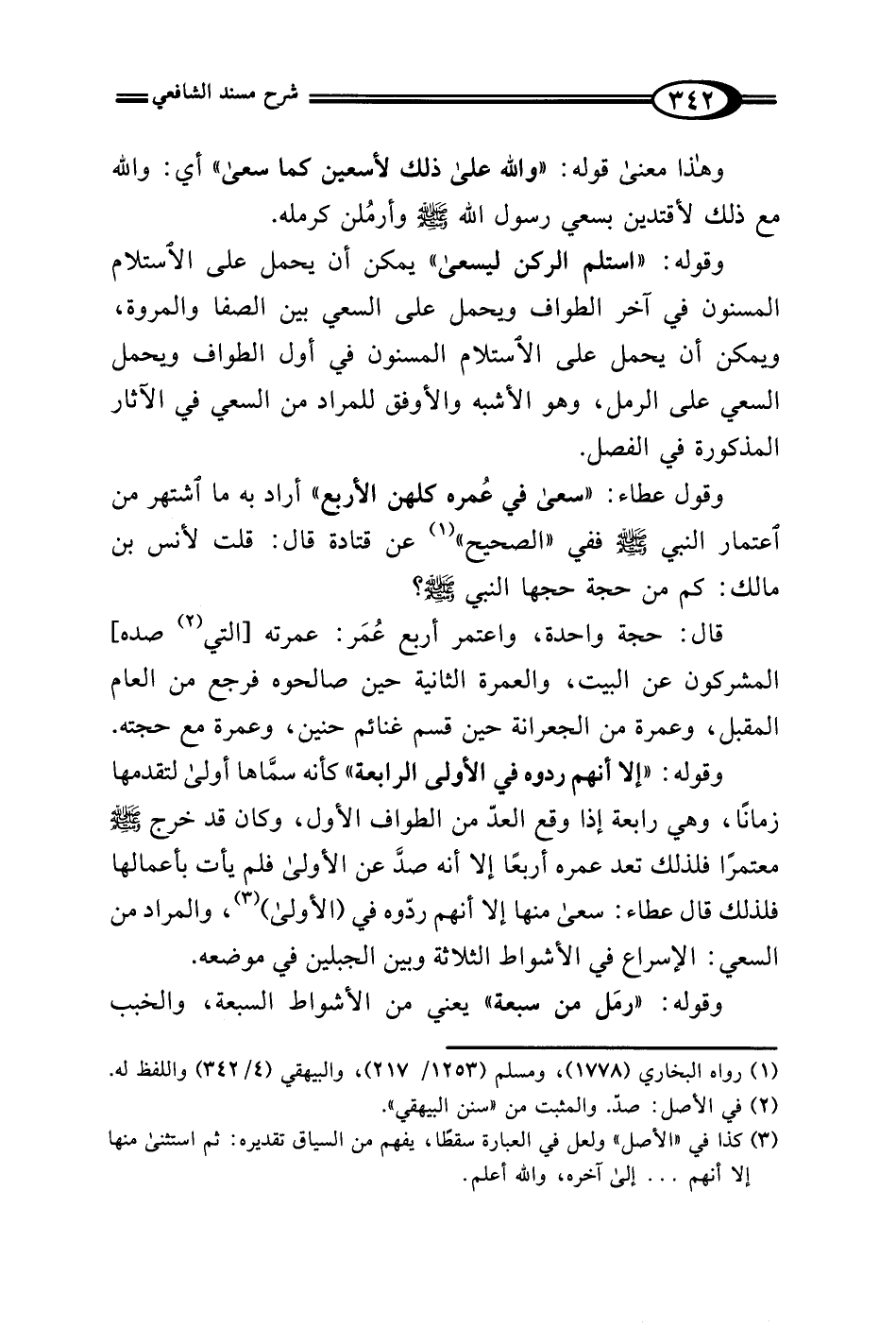 وقوله: "استلم الركن ليسعى" يمكن أن يحمل على الاستلام المسنون في آخر الطواف ويحمل على السعي بين الصفا والمروة، ويمكن أن يحمل على الاستلام المسنون في أول الطواف ويحمل السعي على الرمل، وهو الأشبه والأوفق للمراد من السعي في الآثار المذكورة في الفصل.