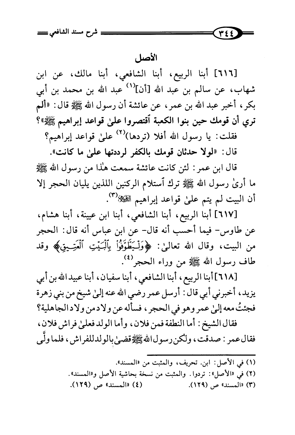[617] أبنا الربيع، أبنا الشافعي، أبنا ابن عيينة، أبنا هشام، عن طاوس -فيما أحسب أنه قال- عن ابن عباس أنه قال: الحجر من البيت، وقال الله تعالى: {وَلْيَطَّوَّفُوا بِالْبَيْتِ الْعَتِيقِ} وقد طاف رسول الله - صلى الله عليه وسلم - من وراء الحجر (¬4).