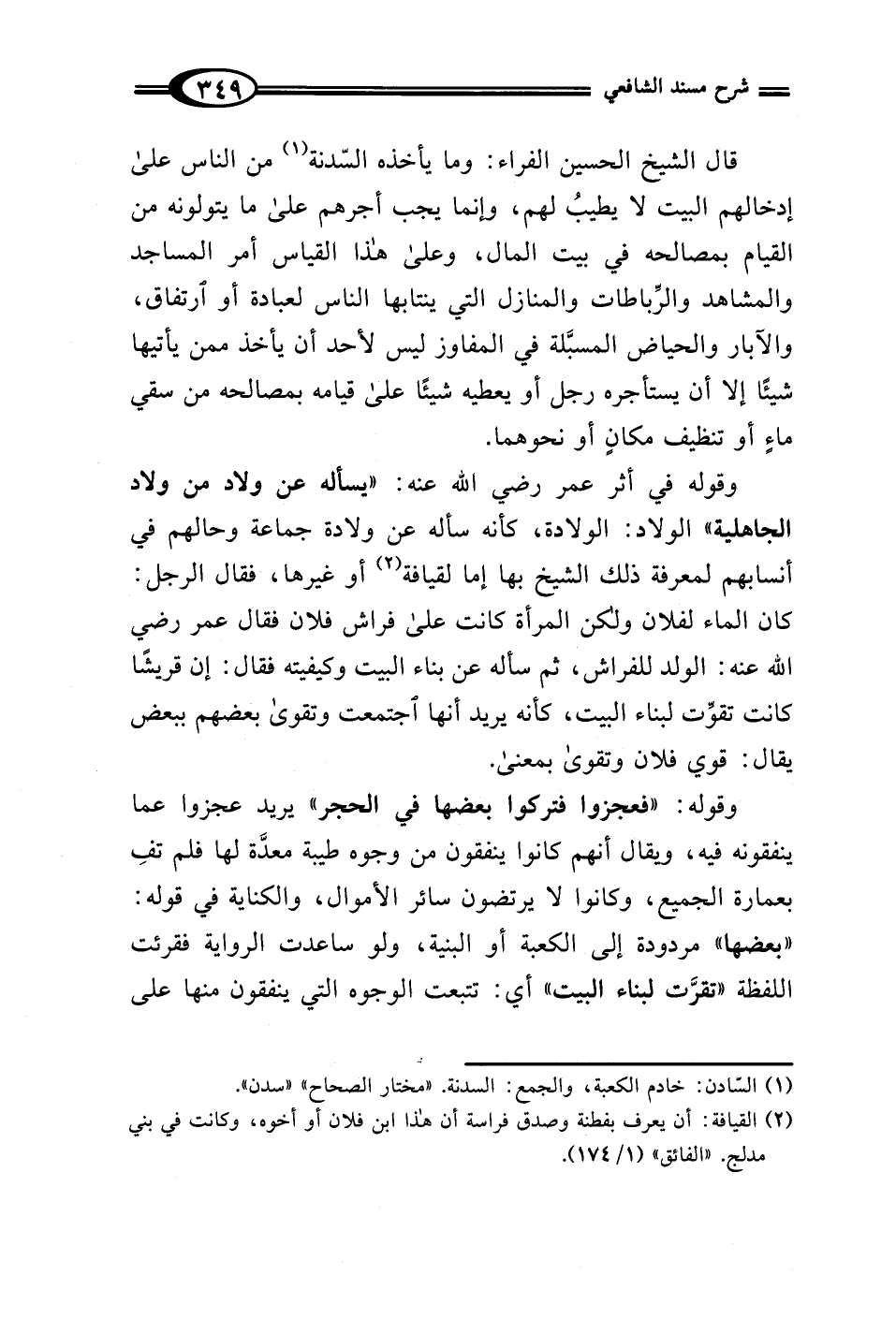 وقوله في أثر عمر رضي الله عنه: "يسأله عن ولاد من ولاد الجاهلية" الولاد: الولادة، كأنه سأله عن ولادة جماعة وحالهم في أنسابهم لمعرفة ذلك الشيخ بها إما لقيافة (¬2) أو غيرها، فقال الرجل: كان الماء لفلان ولكن المرأة كانت على فراش فلان فقال عمر رضي الله عنه: الولد للفراش، ثم سأله عن بناء البيت وكيفيته فقال: إن قريشًا كانت تقوِّت لبناء البيت، كأنه يريد أنها اجتمعت وتقوى بعضهم ببعض يقال: قوي فلان وتقوى بمعنى.