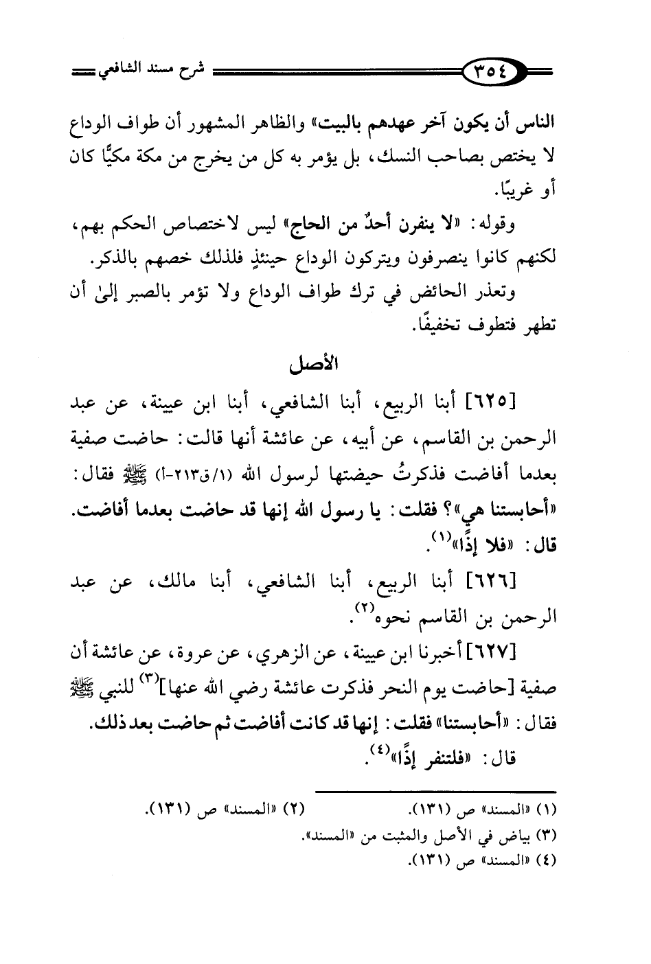 [625] أبنا الربيع، أبنا الشافعي، أبنا ابن عيينة، عن عبد الرحمن بن القاسم، عن أبيه، عن عائشة أنها قالت: حاضت صفية بعدما أفاضت فذكرتُ حيضتها لرسول الله - صلى الله عليه وسلم - فقال: "أحابستنا هي"؟ فقلت: يا رسول الله إنها قد حاضت بعدما أفاضت.