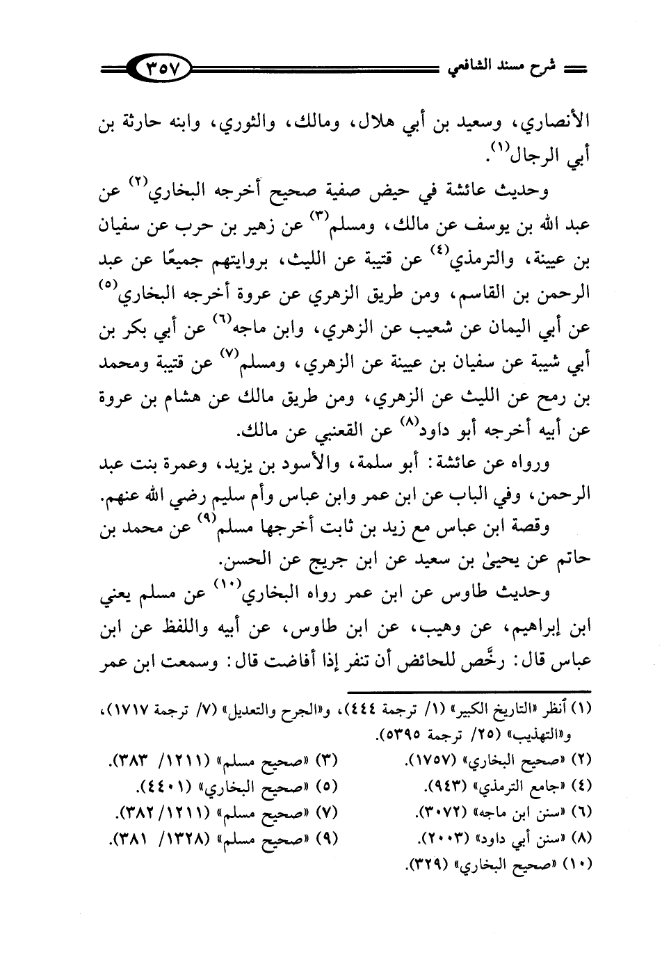 وحديث عائشة في حيض صفية صحيح أخرجه البخاري (¬2) عن عبد الله بن يوسف عن مالك، ومسلم (¬3) عن زهير بن حرب عن سفيان بن عيينة، والترمذي (¬4) عن قتيبة عن الليث، بروايتهم جميعًا عن عبد الرحمن بن القاسم، ومن طريق الزهري عن عروة أخرجه البخاري (¬5) عن أبي اليمان عن شعيب عن الزهري، وابن ماجه (¬6) عن أبي بكر بن أبي شيبة عن سفيان بن عيينة عن الزهري، ومسلم (¬7) عن قتيبة ومحمد بن رمح عن الليث عن الزهري، ومن طريق مالك عن هشام بن عروة عن أبيه أخرجه أبو داود (¬8) عن القعنبي عن مالك.