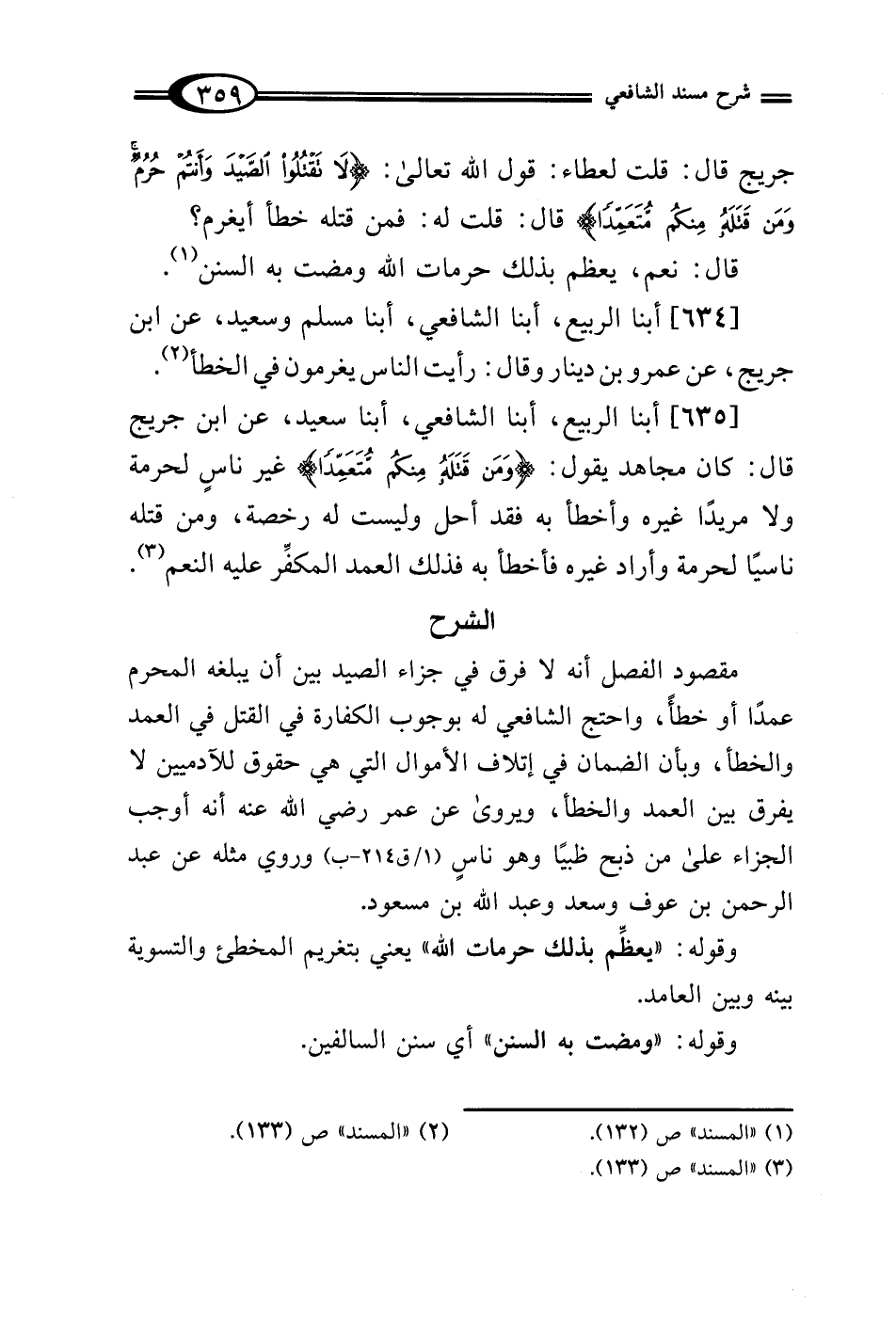 [635] أبنا الربيع، أبنا الشافعي، أبنا سعيد، عن ابن جريج قال: كان مجاهد يقول: {وَمَنْ قَتَلَهُ مِنْكُمْ مُتَعَمِّدًا} غير ناسٍ لحرمة ولا مريدًا غيره وأخطأ به فقد أحل وليست له رخصة، ومن قتله ناسيًا لحرمة وأراد غيره فأخطأ به فذلك العمد المكفِّر عليه النعم (¬3).