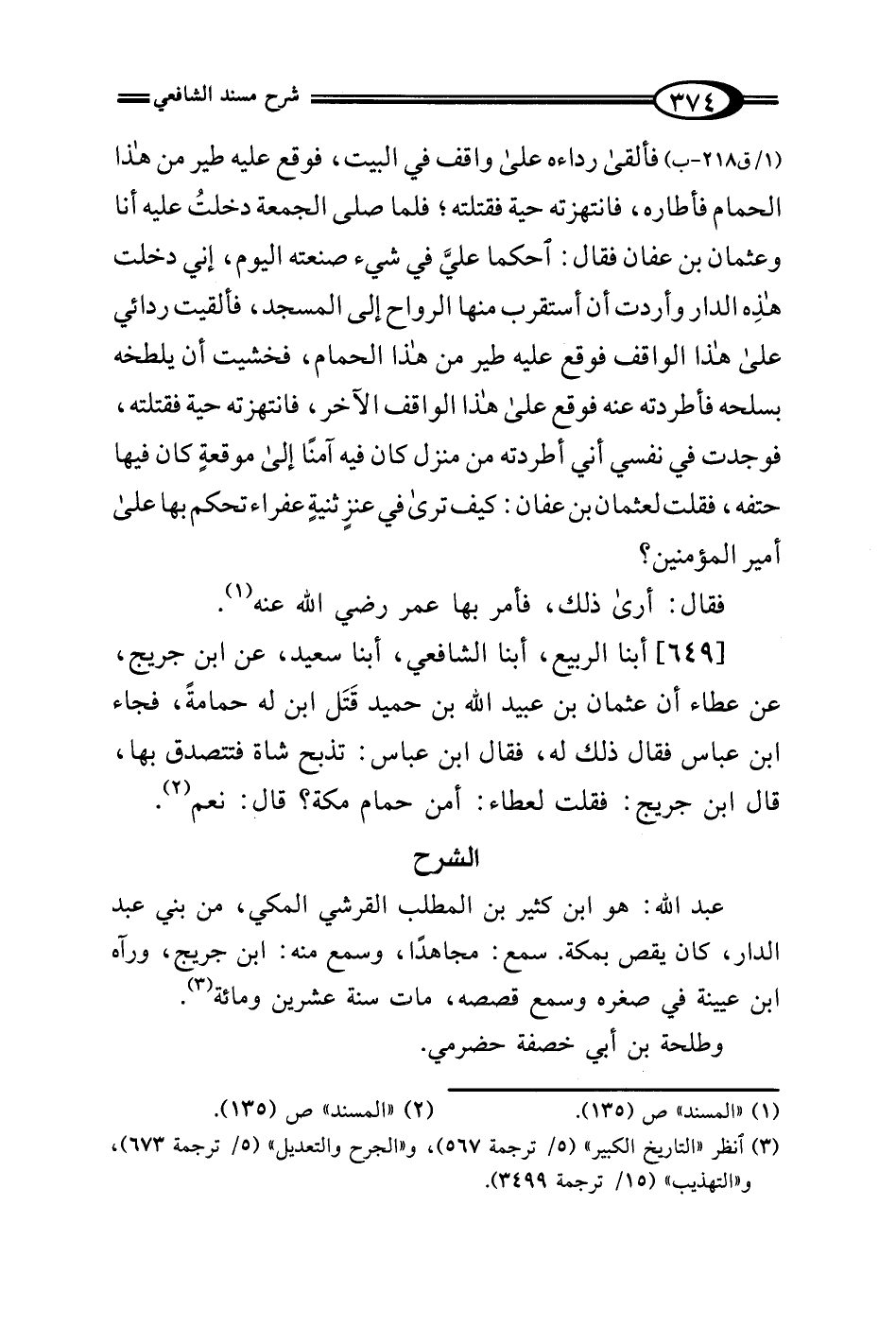 [649] أبنا الربيع، أبنا الشافعي، أبنا سعيد، عن ابن جريج، عن عطاء أن عثمان بن عبيد الله بن حميد قَتَل ابن له حمامةً، فجاء ابن عباس فقال ذلك له، فقال ابن عباس: تذبح شاة فتتصدق بها، قال ابن جريج: فقلت لعطاء: أمن حمام مكة؟ قال: نعم (¬2).