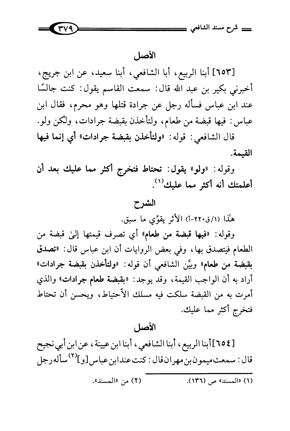 [653] أبنا الربيع، أبا الشافعي، أبنا سعيد، عن ابن جريج، أخبرني بكير بن عبد الله قال: سمعت القاسم يقول: كنت جالسًا عند ابن عباس فسأله رجل عن جرادة قتلها وهو محرم، فقال ابن عباس: فيها قبضة من طعام، ولتأخذن بقبضة جرادات، ولكن ولو.