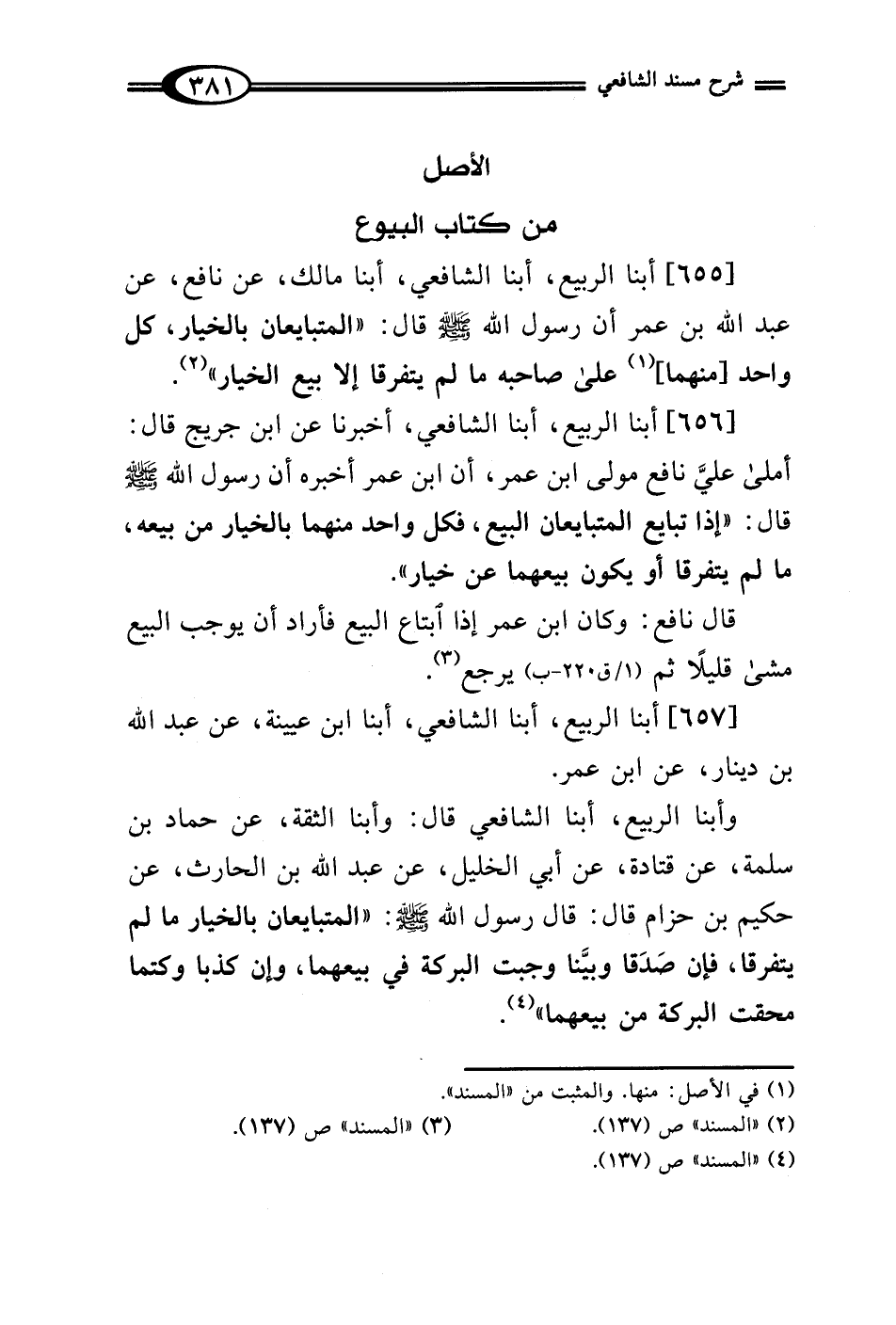 وأبنا الربيع، أبنا الشافعي قال: وأبنا الثقة، عن حماد بن سلمة، عن قتادة، عن أبي الخليل، عن عبد الله بن الحارث، عن حكيم بن حزام قال: قال رسول الله - صلى الله عليه وسلم -: "المتبايعان بالخيار ما لم يتفرقا، فإن صَدَقا وبيَّنا وجبت البركة في بيعهما، وإن كذبا وكتما محقت البركة من بيعهما" (¬4).